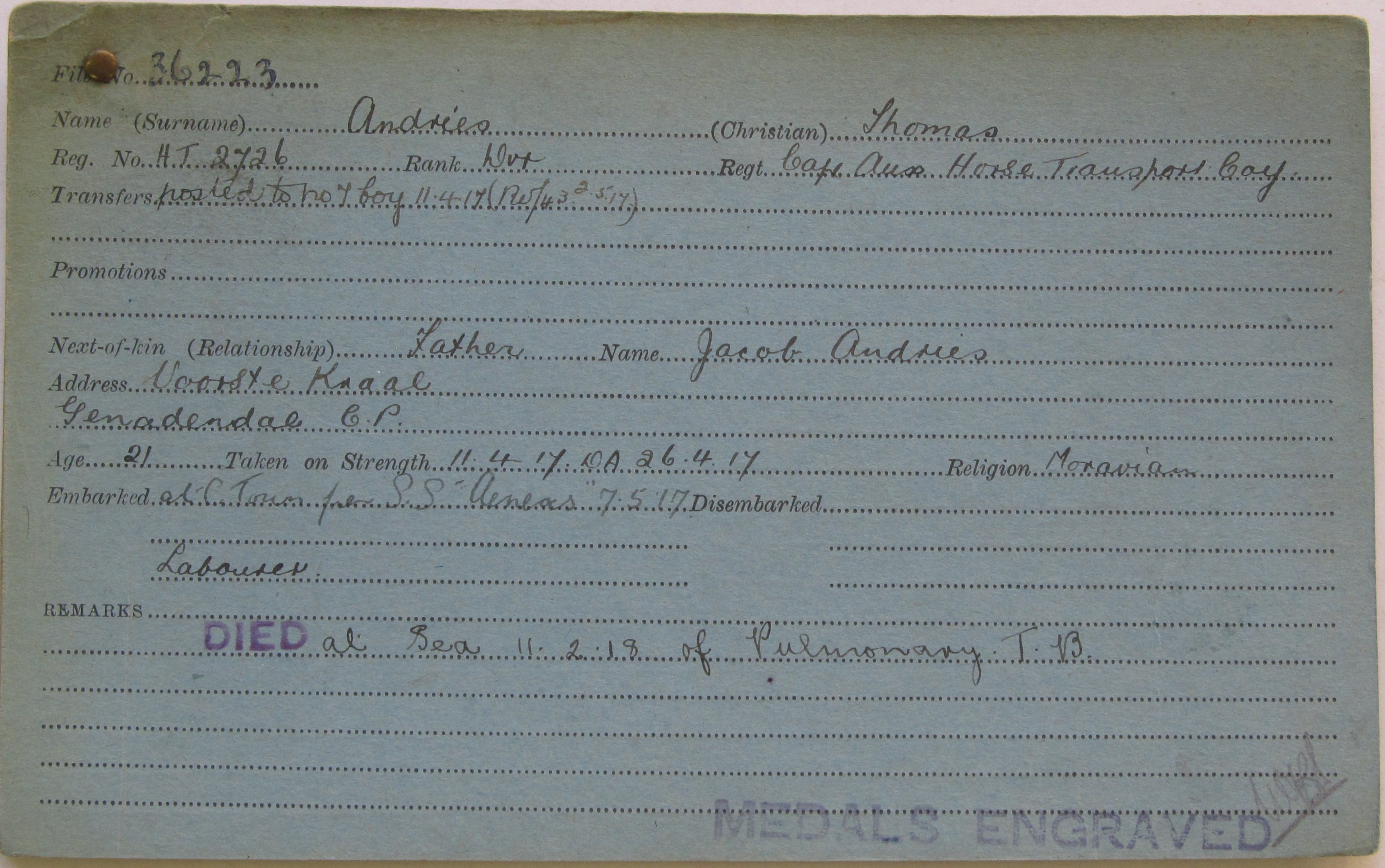 Son of Jakob and Augusta Andries, of Voorste Kraal, Genadendal, Caledon, Cape Province.
