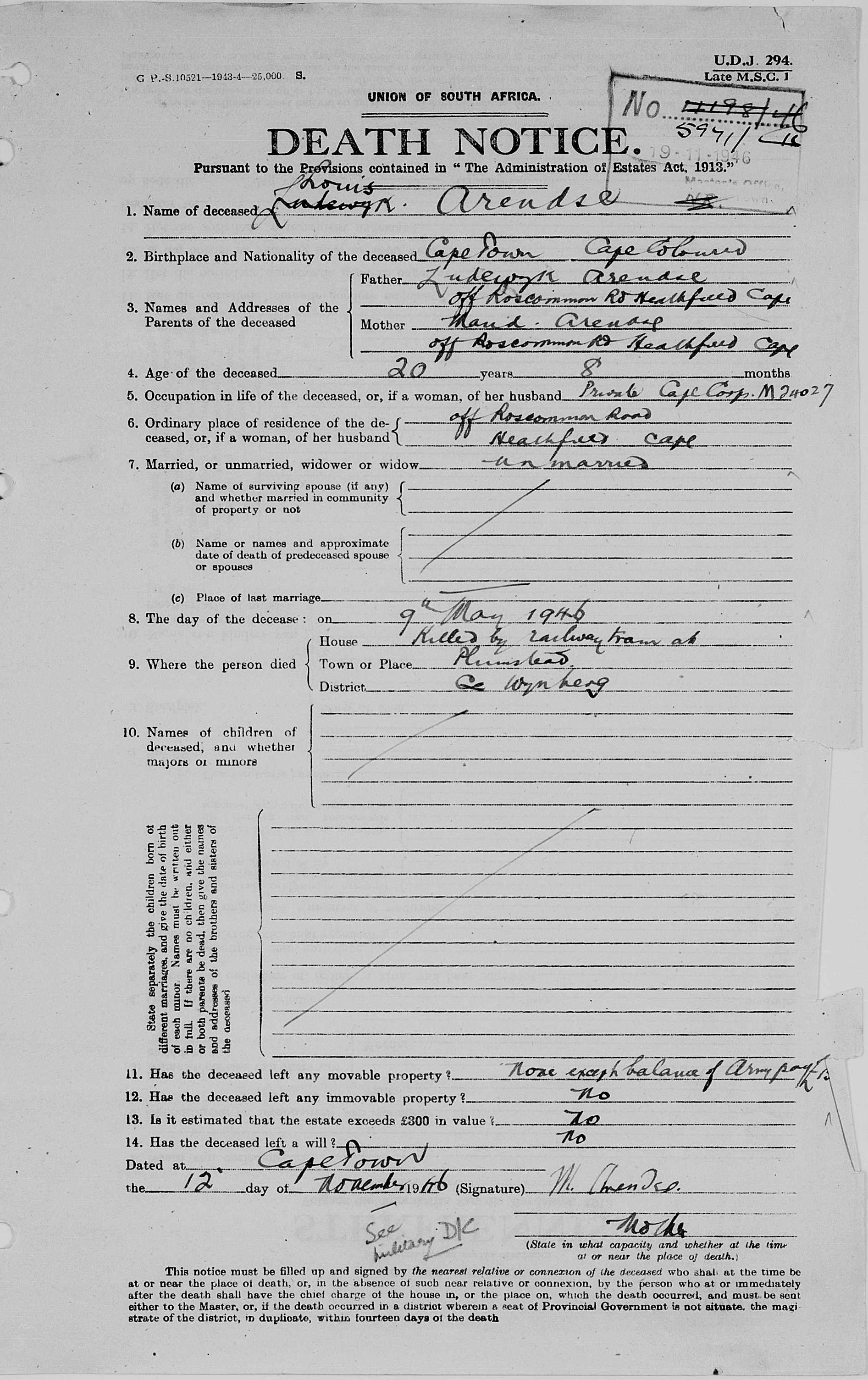 Son of Lodewyk and Maud Arendse, of Heathfield, Cape Province. Born Cape Town
