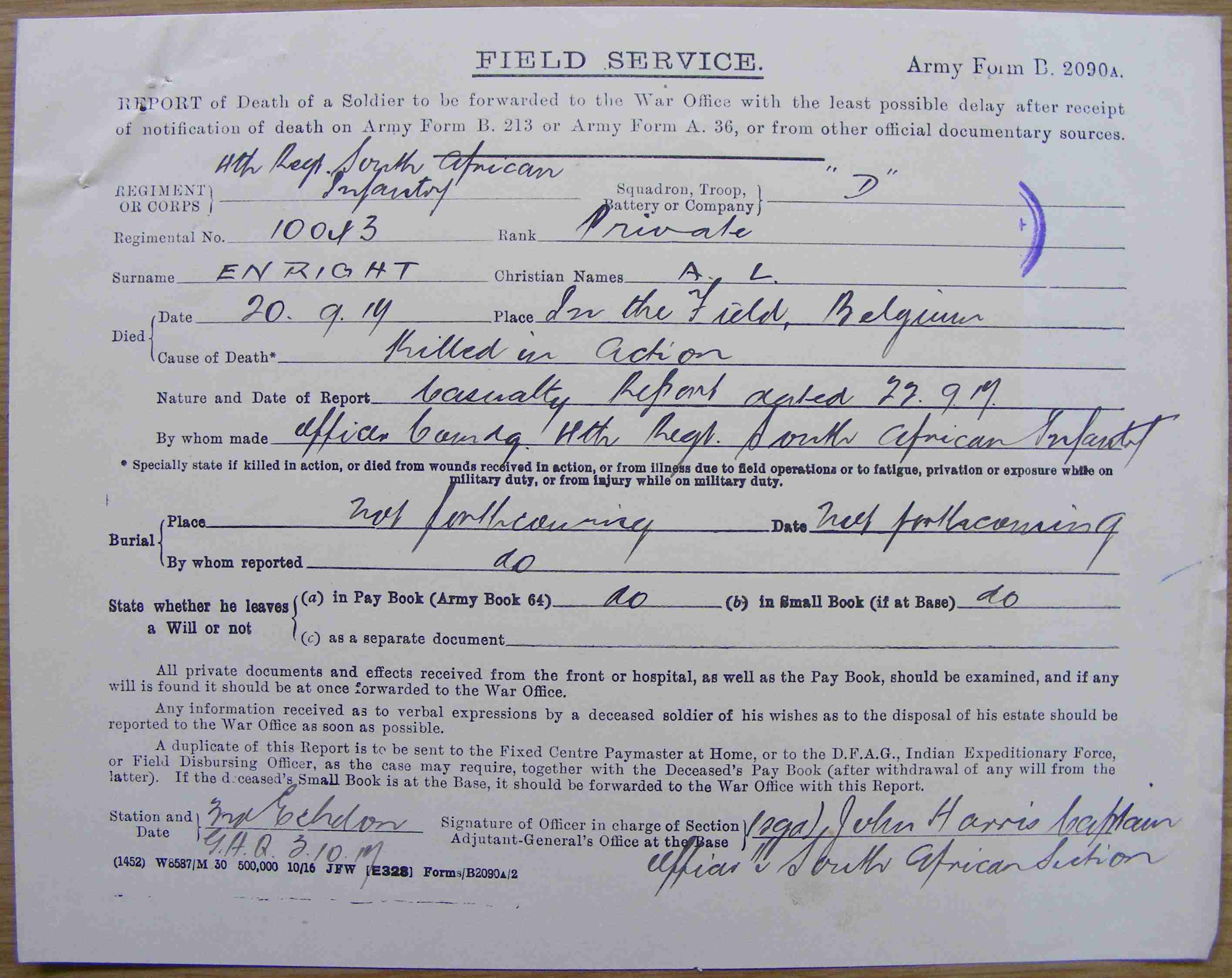 Son of Mr. John Michael Enright and Mrs. J. E. Lewis-Enright, of 44, Leeuwpoort St., Boksburg, Transvaal. ***CWGC has LEWIS-ENRIGHT on memorial