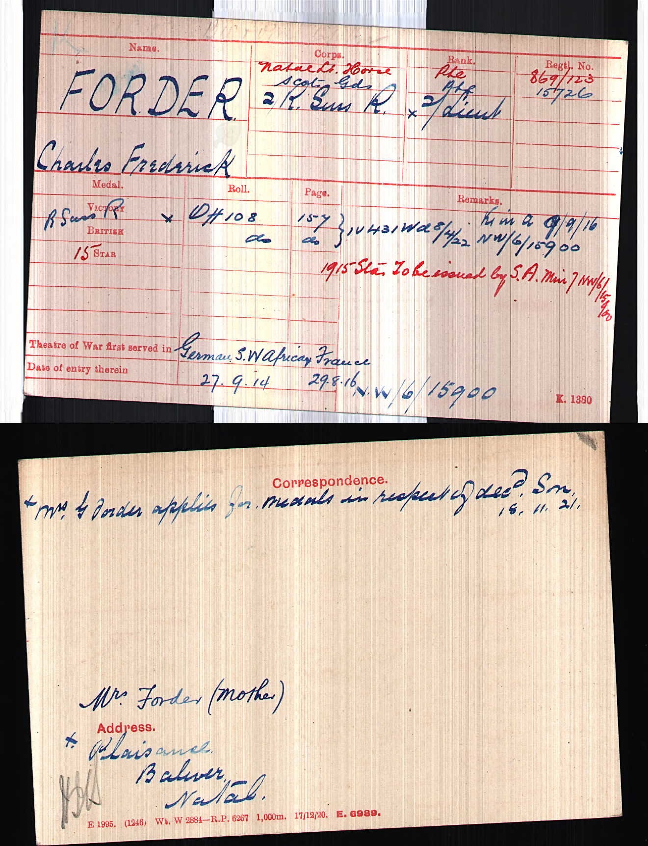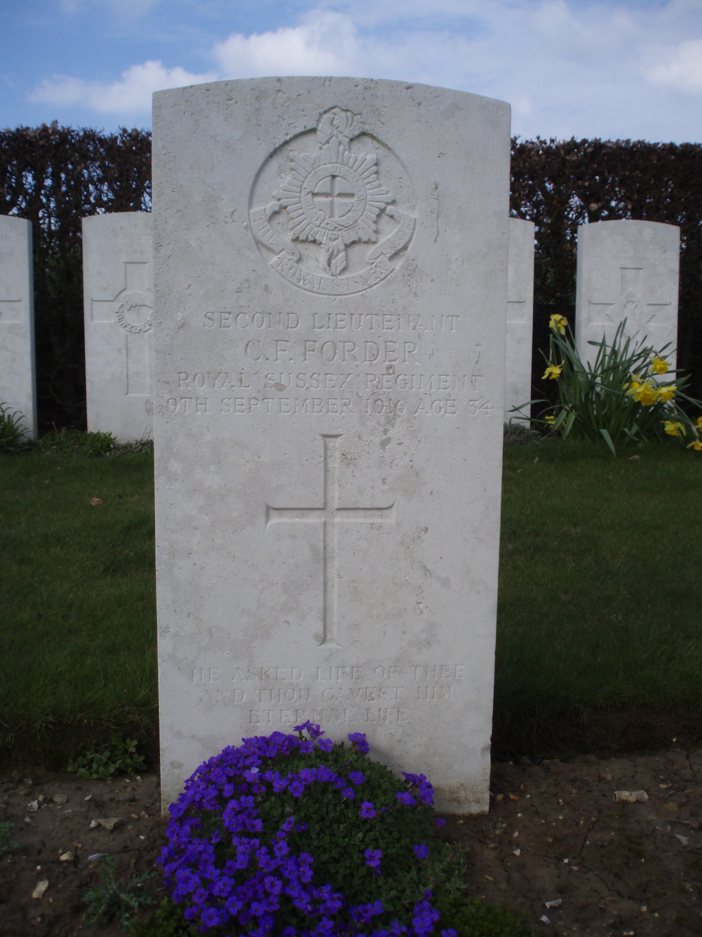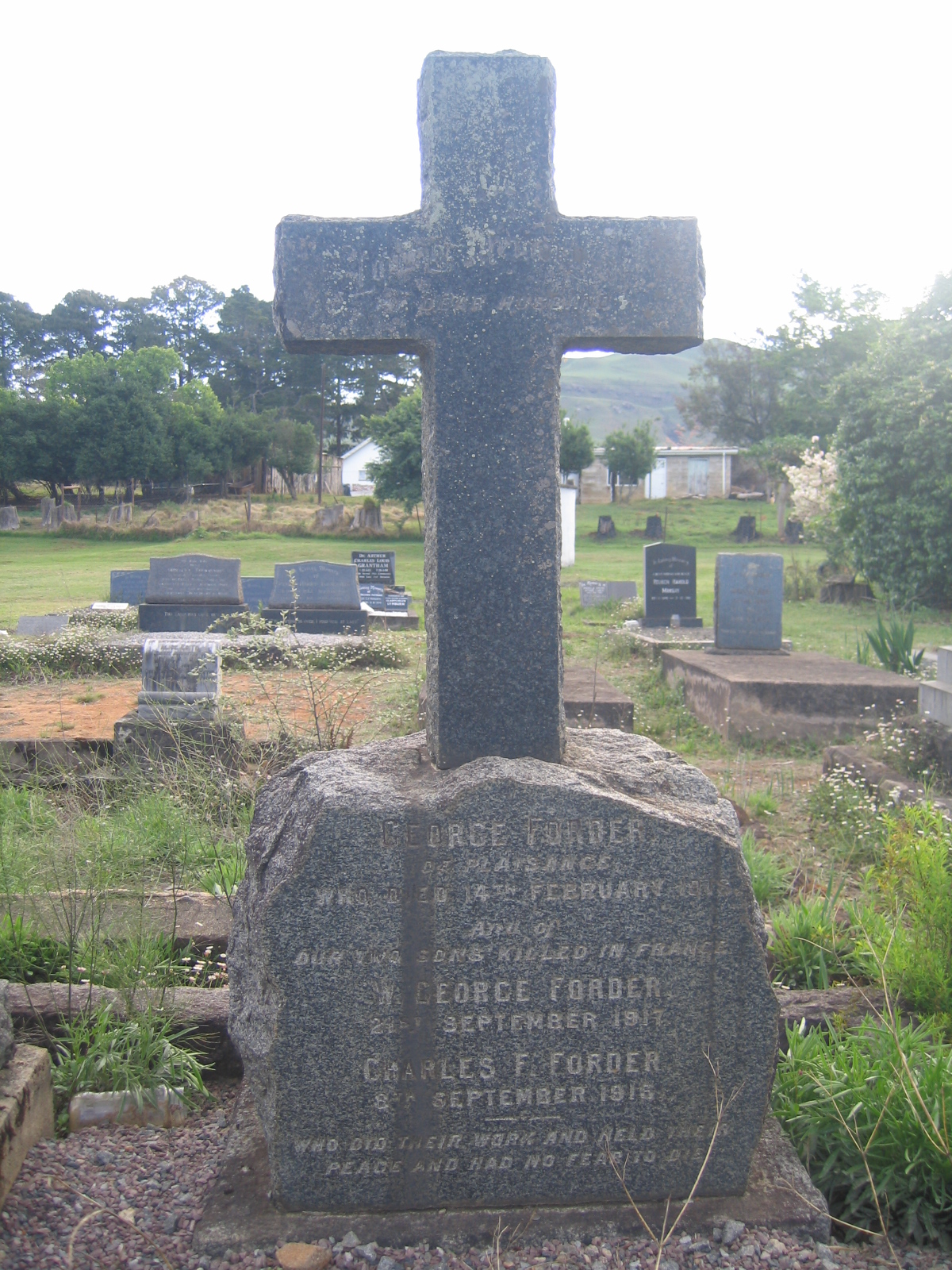 Son of George and Margaret Forder, of Plaisance, Bulwer, Natal, South Africa. His brother also died on service. Commemoration stone in Bulwer (Yellowhead Church) Cemetery