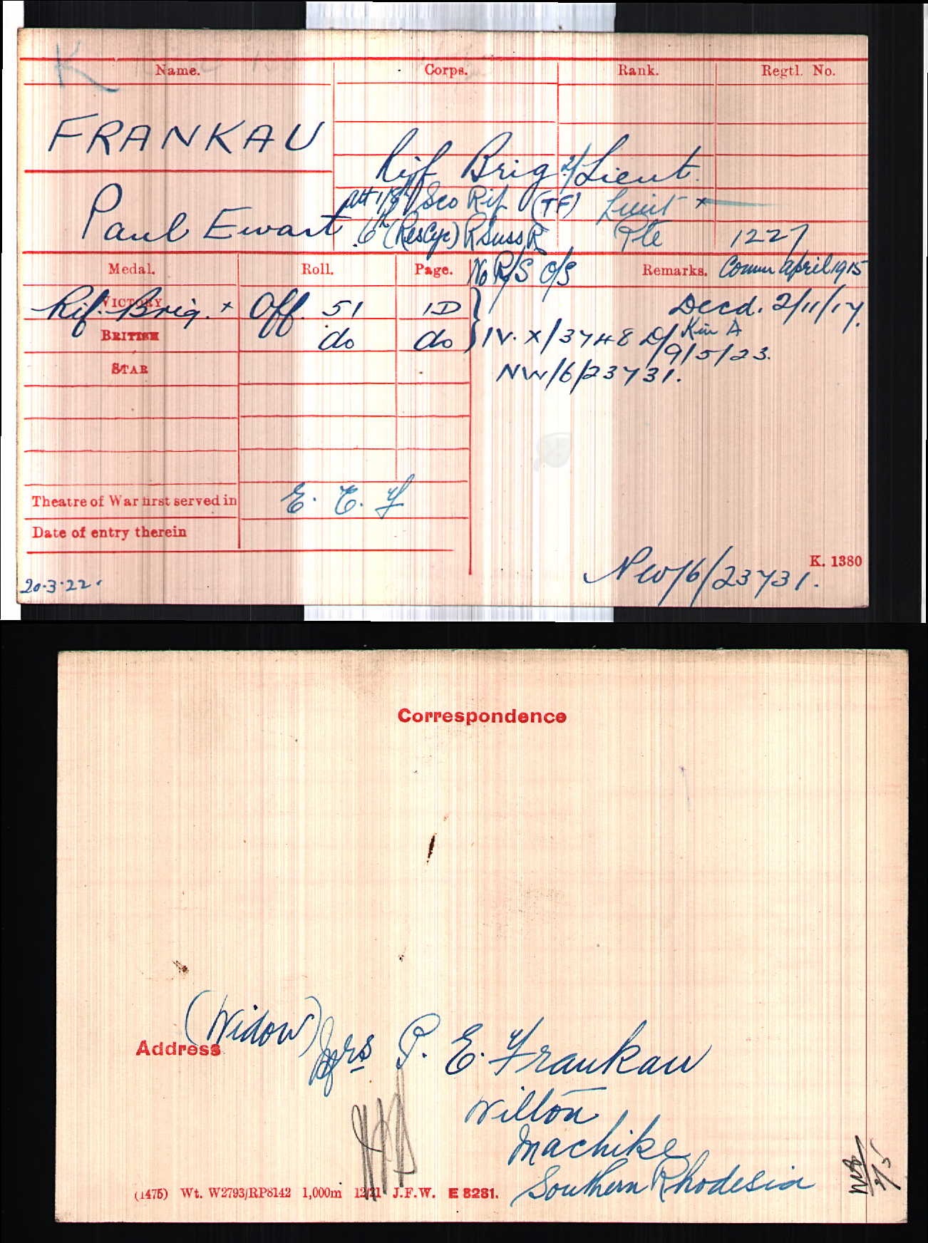 Son of the late Arthur and Julia Frankau; husband of Frances Alica de Burgh Frankau, of Wilton, Macheke, Southern Rhodesia. b. 1890. One of his brothers, Gilbert Frankau, was well-known as a war poet and novelist. Paul, known as Jack, was a farmer in the Wilton district and married to Frances Frankau, who a local remembers was running the Theydon Post Office in the early 1950's. On Macheke War Memorial