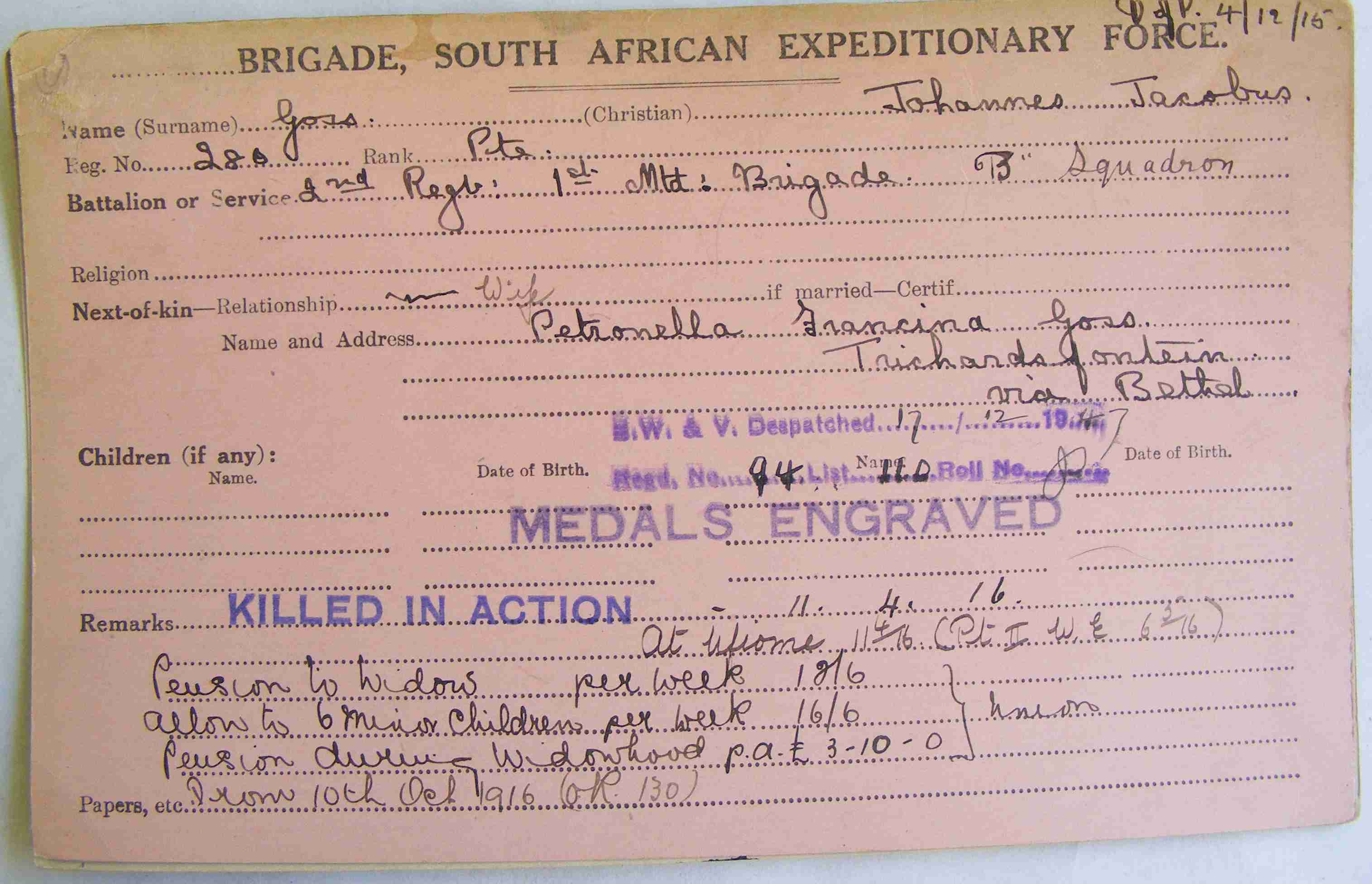 Son of Pieter Willem and Hester Maria Goss. Husband of Petronella Francina Goss, of Trichardsfontein, via Bethel. Born Natal. |