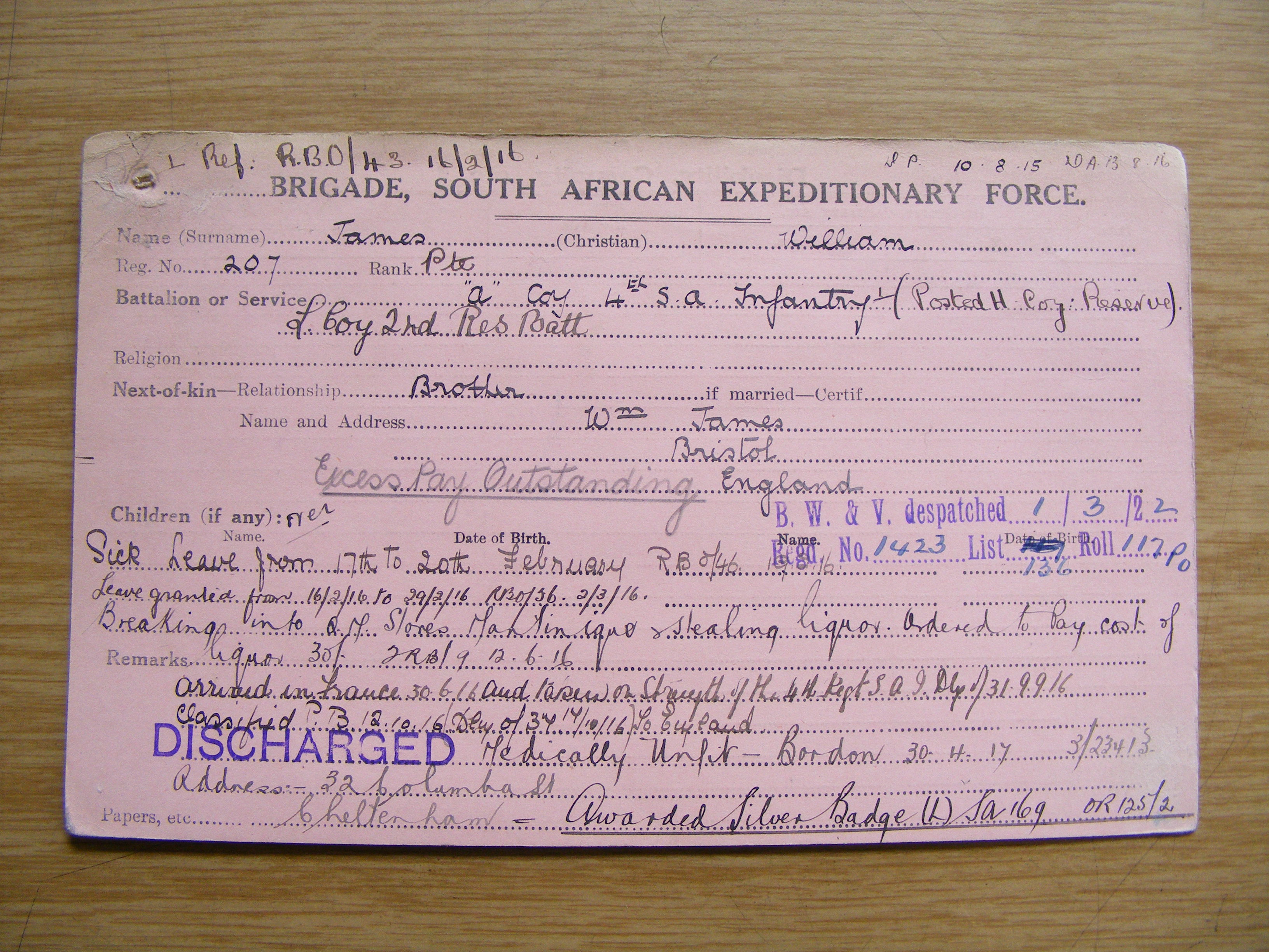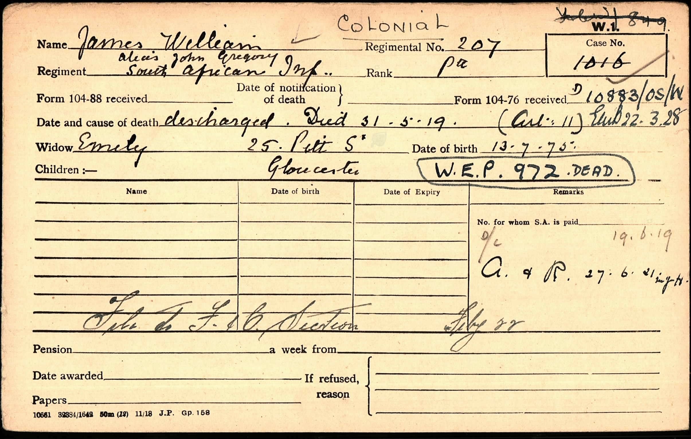 Husband of Emily T. Gregory, of 1, Crowthers Cottages, Malvern St., Cheltenham, England. (Served as JAMES, William).