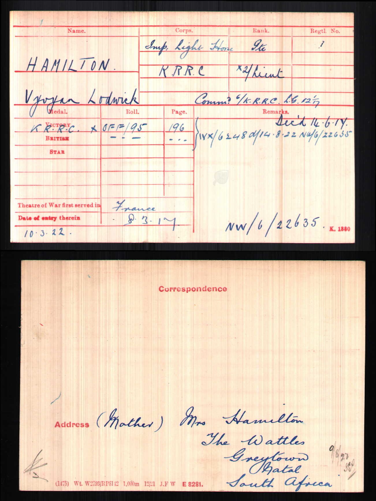 Son of Constance Hamilton, of The Wattles, Greytown, Natal, South Africa, and the late Cyril Hamilton, D.S.O. Served with 2nd Imperial Light Horse in German East Africa.