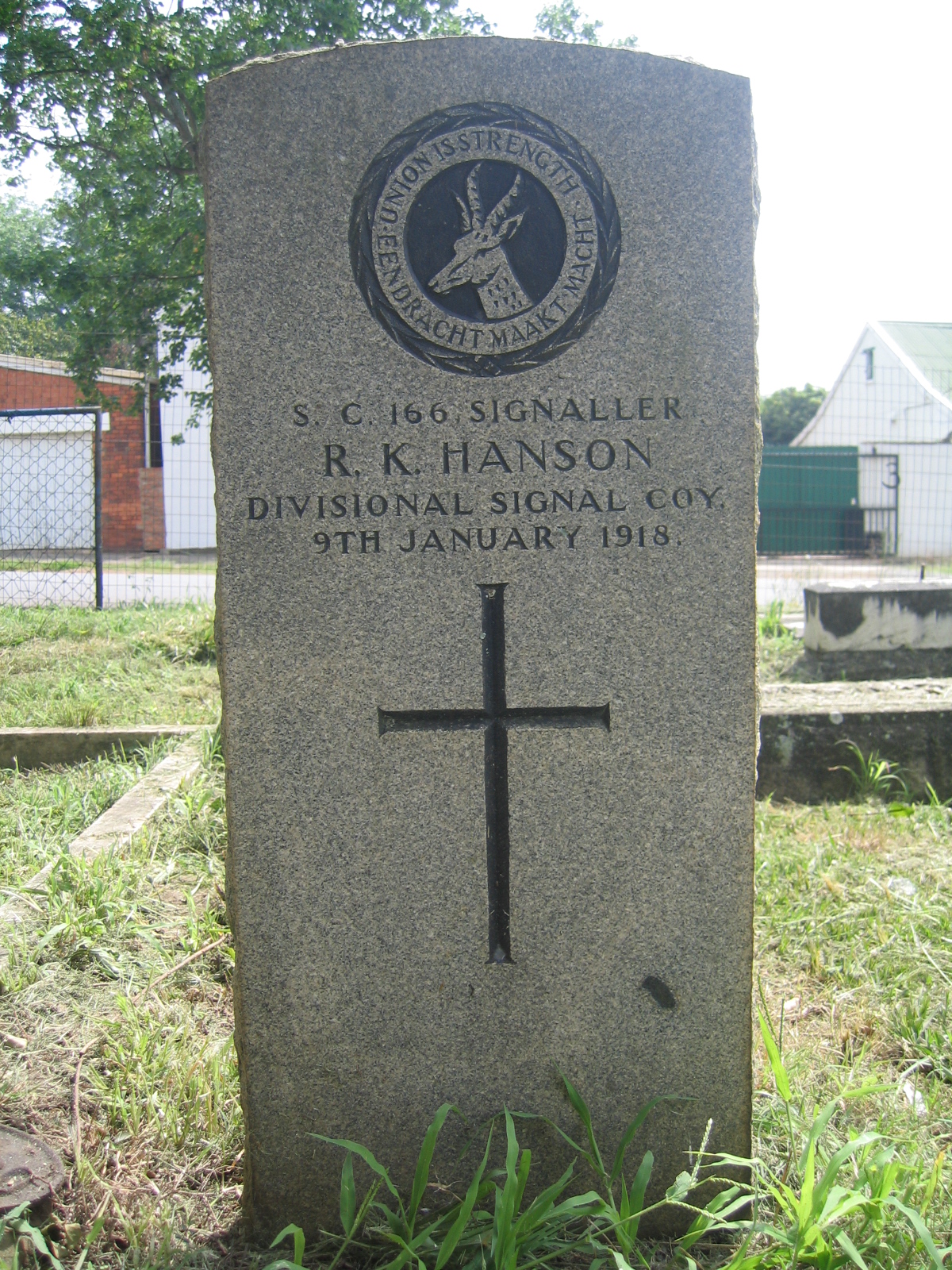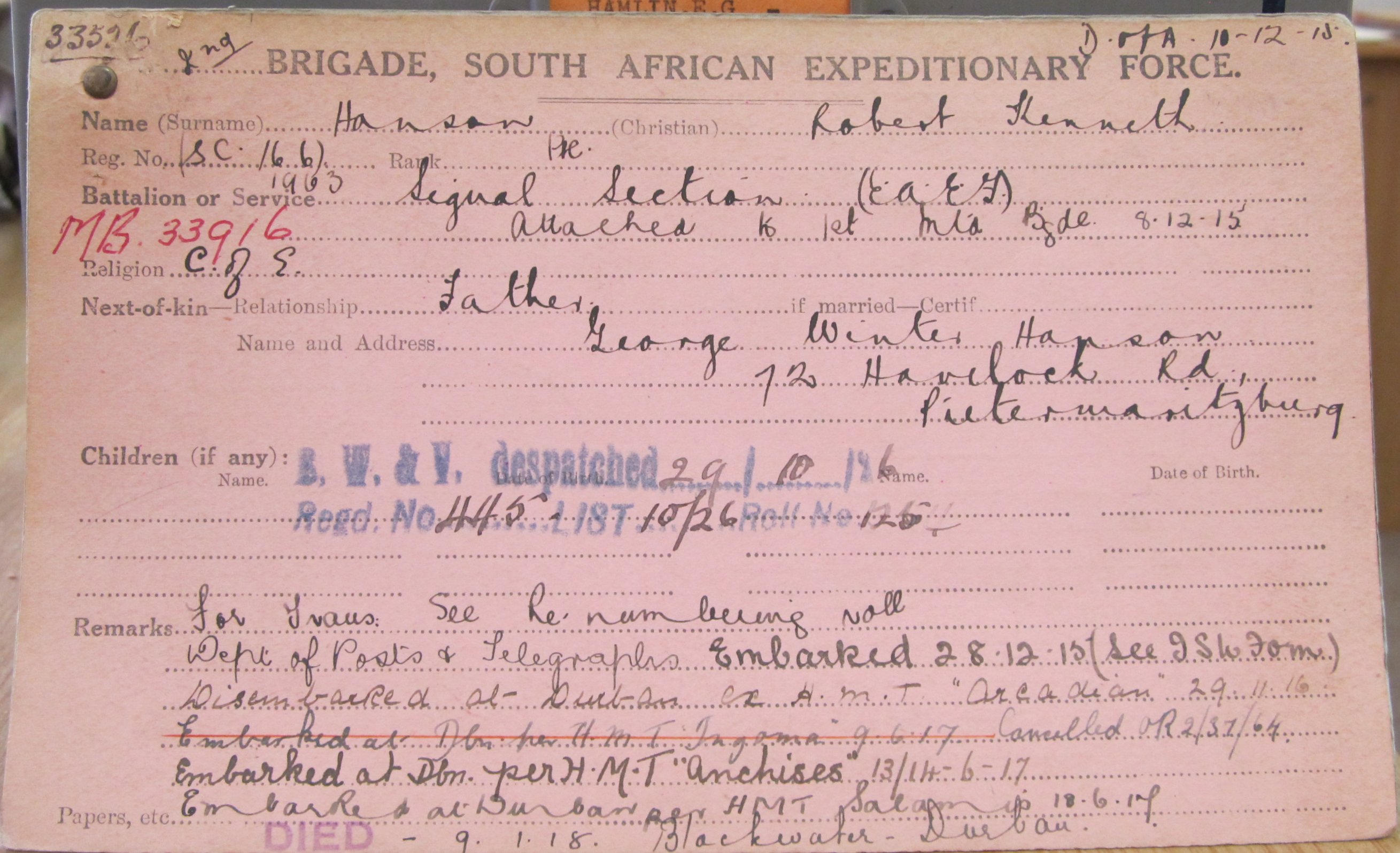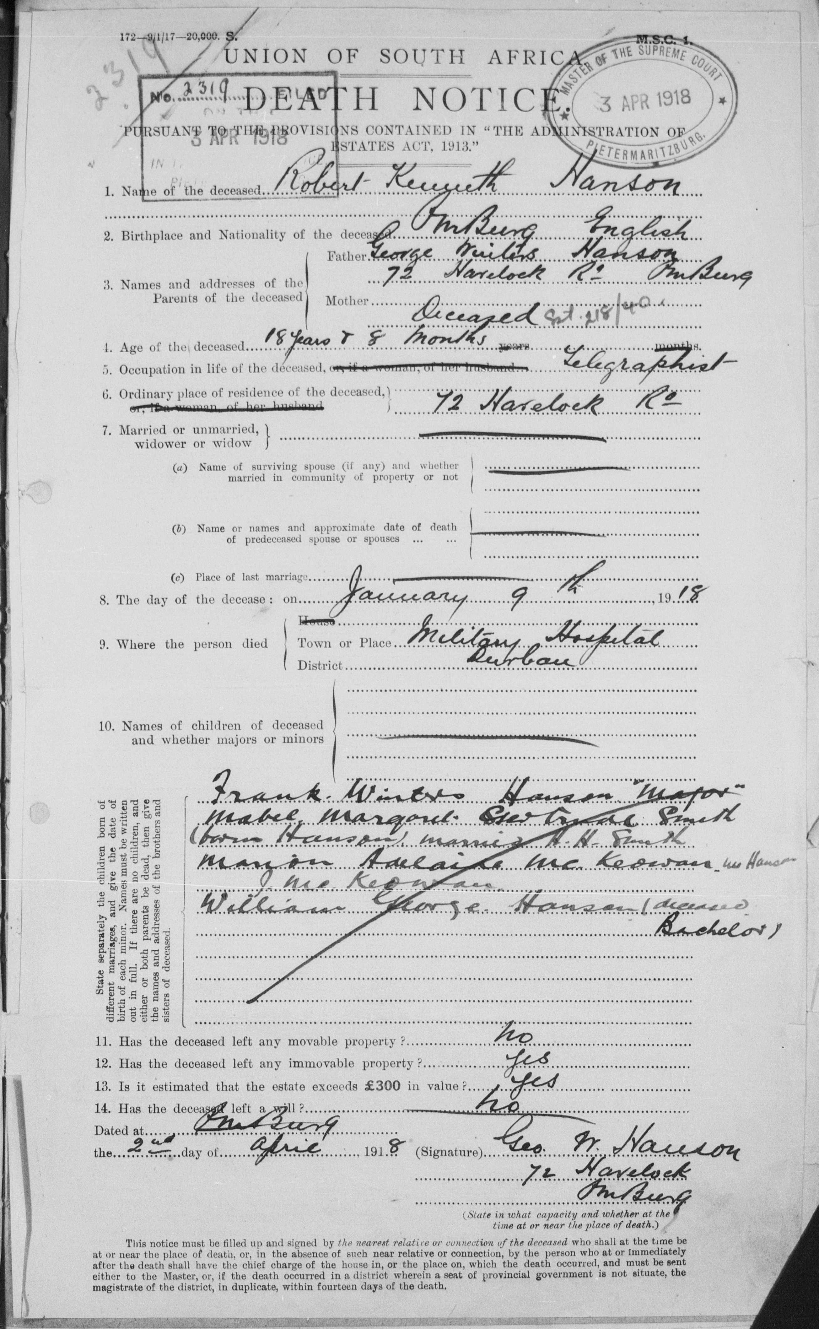 Son of George Winter Hanson, of 72 Havelock Road, Pietermaritzburg
