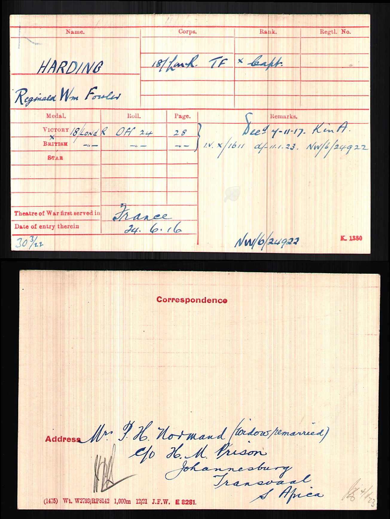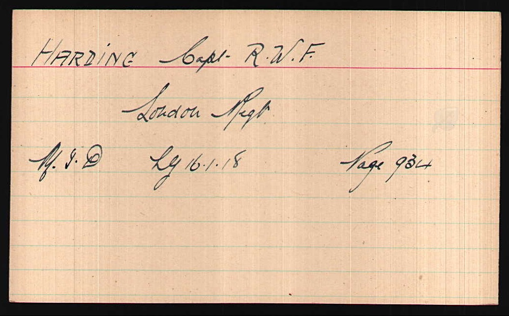 Son of Richmond and Alice Harding, of "Cranmore," Osterley Rd., Isleworth, Middx.; husband of Agnes Dorothea Norman (formerly Harding), of Johannesburg, South Africa. Born in 1887 and educated at St. Pauls, where he developed a very great athletic ability. He represented his School at Cricket and Football and was the champion fives player. In 1910 he became a member of the Stock Exchange. It was then that he became a first class Lawn Tennis player. He was the champion of the Chiswick Park Lawn Tennis Club and played in many open tournaments. In 1914 he was playing splendidly and reached the final for the plate at Wimbledon. He was given a commission in the 18th Battalion, London Regiment (London Irish Rifles) in August 1914, and was promoted to Captain in May of the next year. With the famous 60th Division he saw active service in France, Salonica, Egypt and Palestine, and was Mentioned in Despatches. He was mortally wounded at Tel el Sheria on the morning of the 7 November 1917. His General wrote: "I knew him very well, as shortly before these operations commenced his company won the prize for the smartest company in the Division. He was the very best type of a fearless and true leader." His Colonel wrote: "He had done so splendidly all through the fighting and led his men in the assault with such gallantry and dash that, had he lived, I should certainly have recommended him for the Military Cross." |