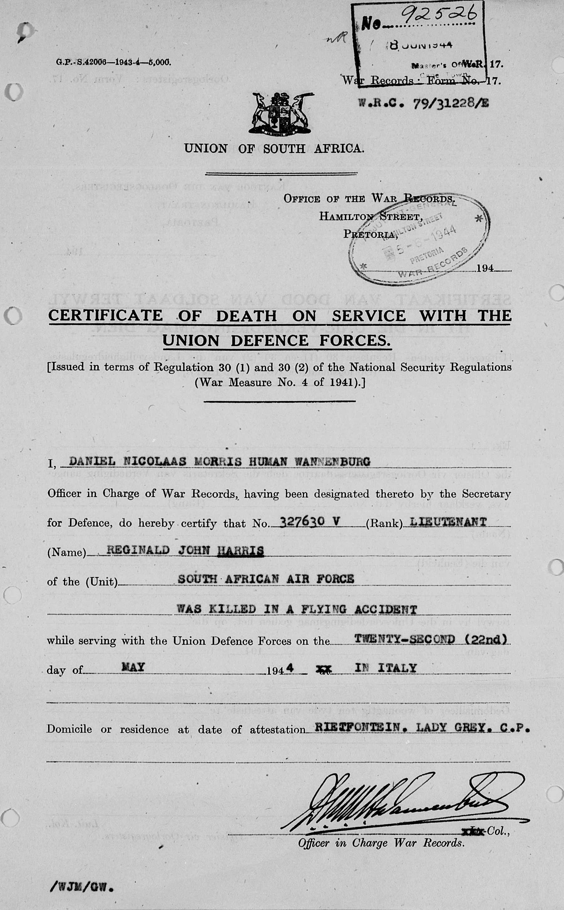 Son of George Henry and Maryna Johanna Harris, of Lady Grey, Cape Province, South Africa. Born Lady Grey |