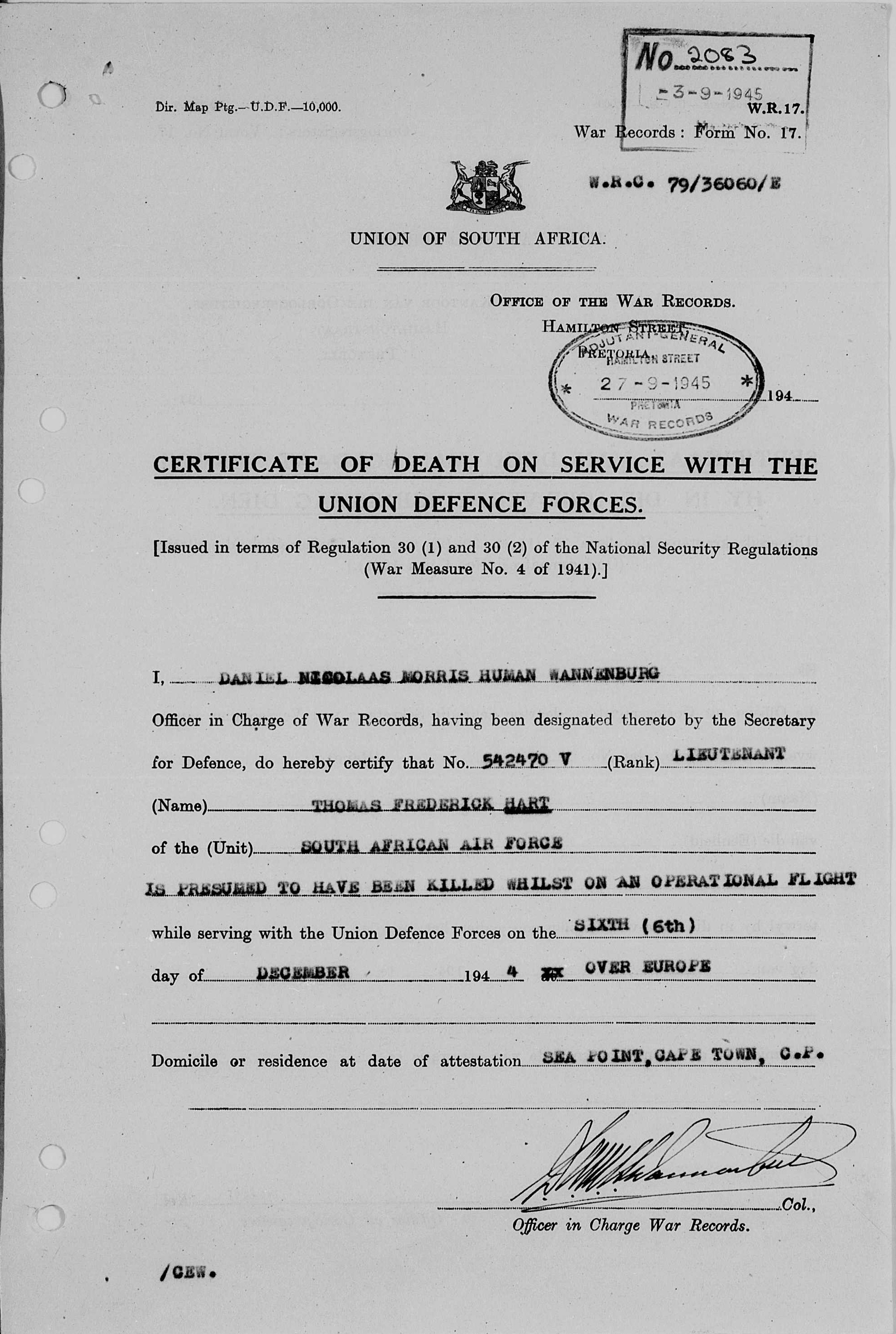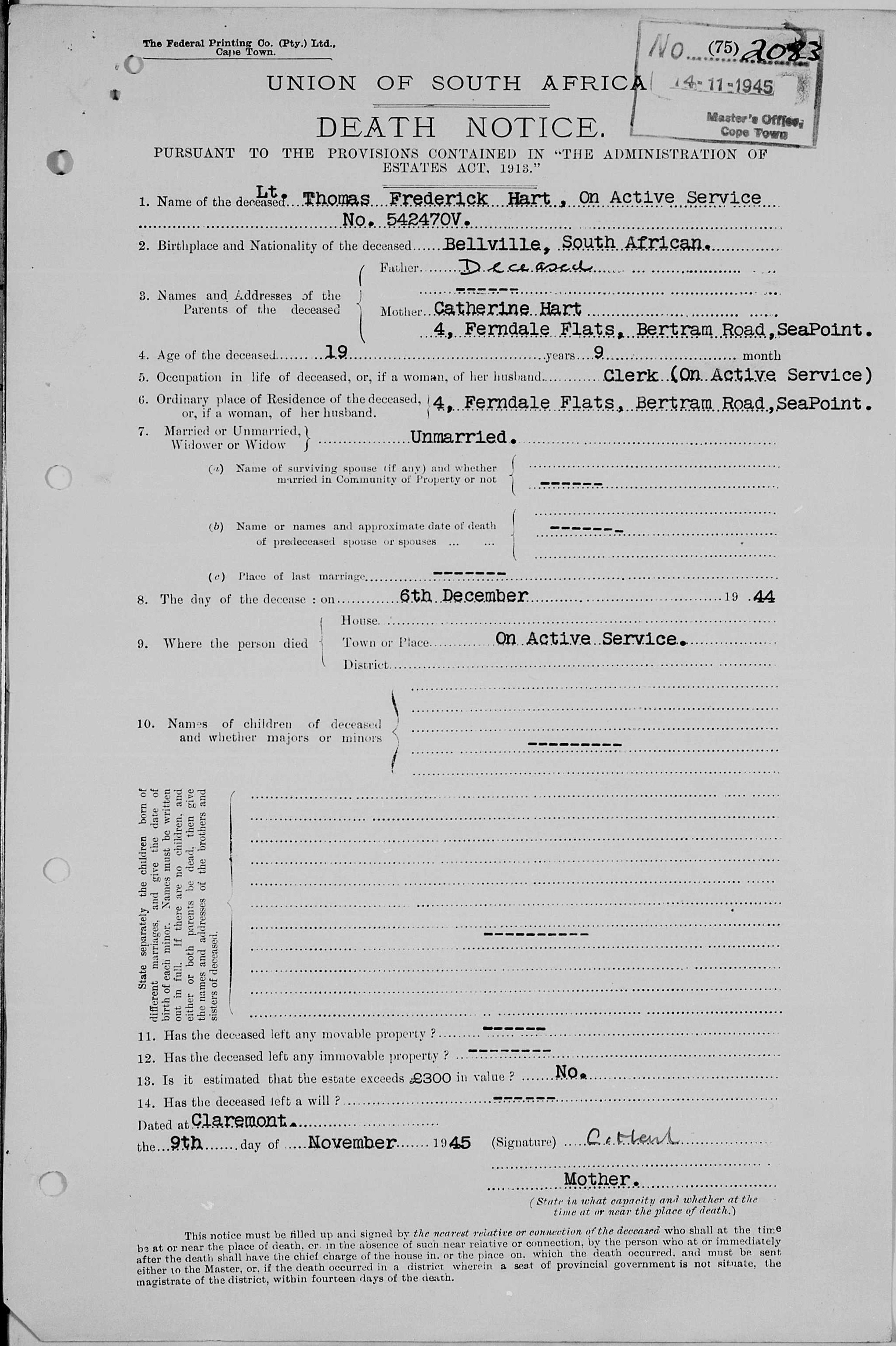 Son of Thomas Joseph and Catharine Hart, of Bertram Road, Sea Point. Born Bellville. A clerk. His brother also died in service |