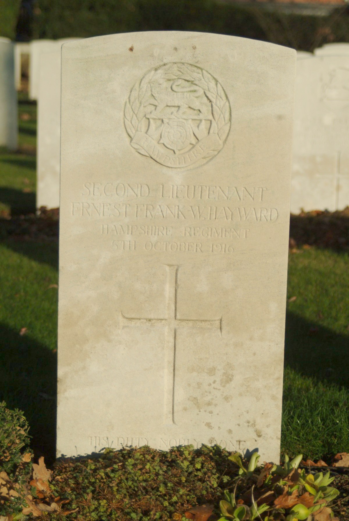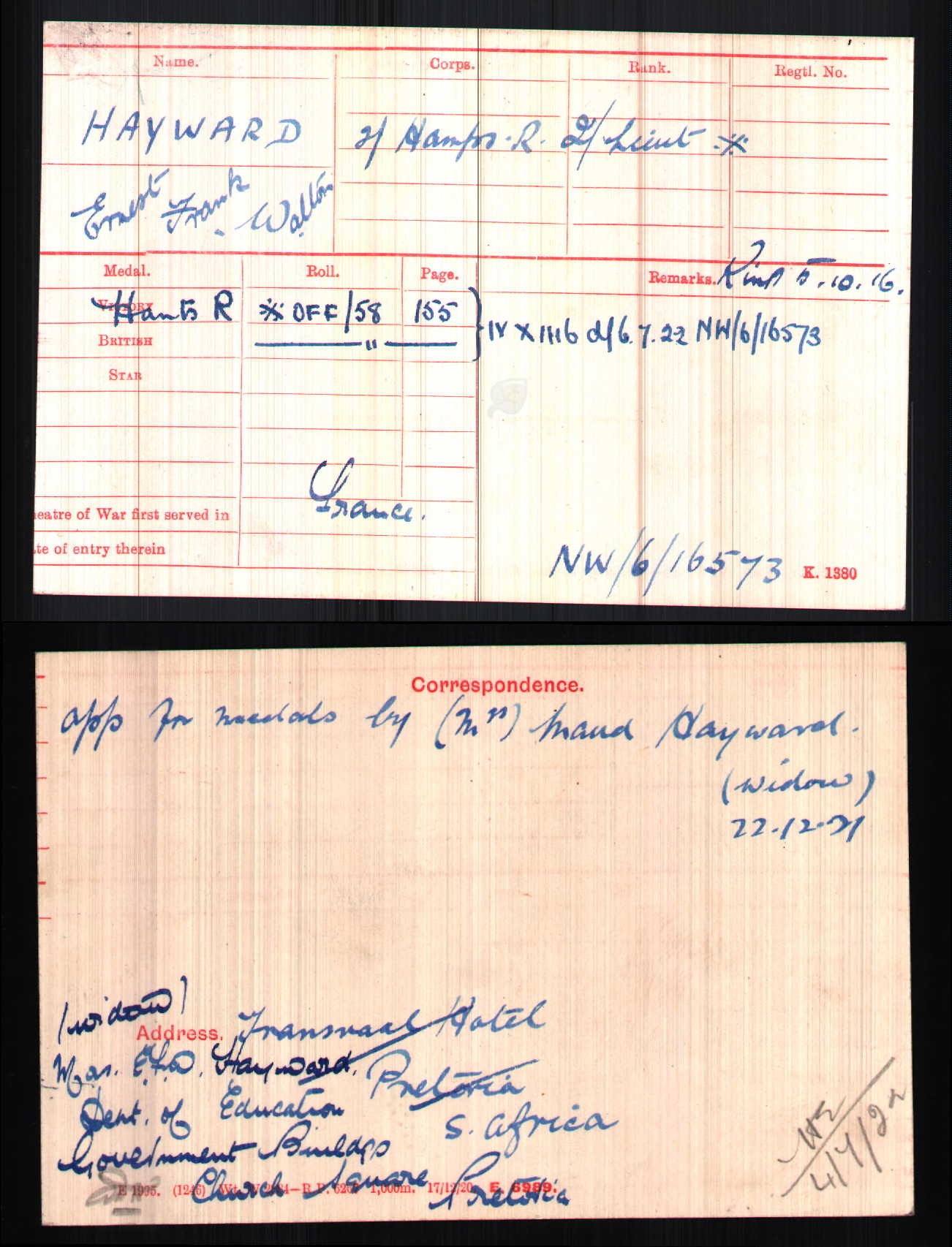 Son of Frederick and Edith Hayward; husband of Maud Beatrice Hayward, of Transvaal Hotel, Pretoria, South Africa. Born Acton, Middx.