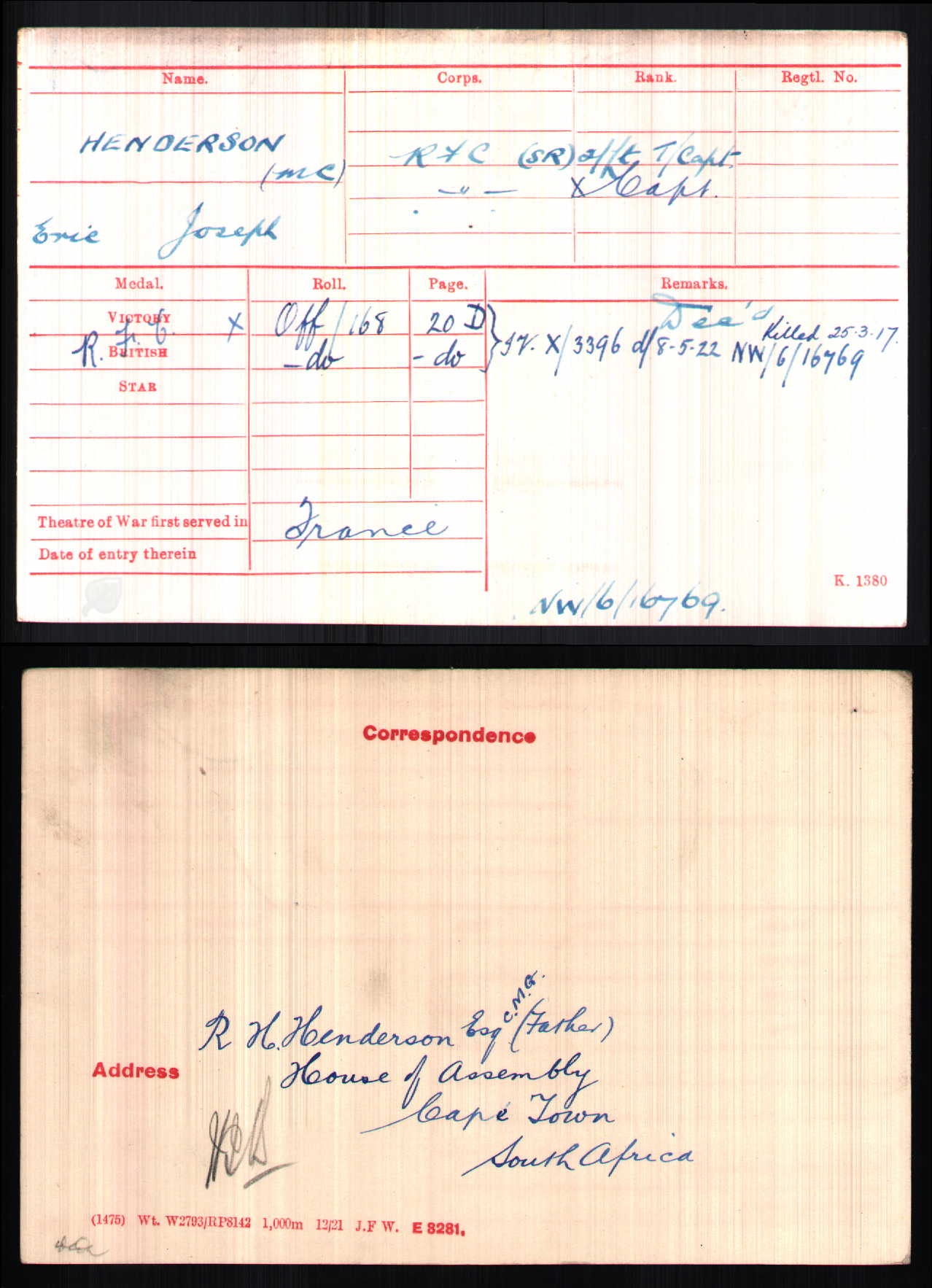 Son of Robert Hugh Henderson, C.M.G., M.L.A., and Mrs. Sarah Matilda Henderson, of Johannesburg, South Africa. Educated at St. Andrew's College, Grahamstown. ref. The sky their battlefield of Trevor Henshaw