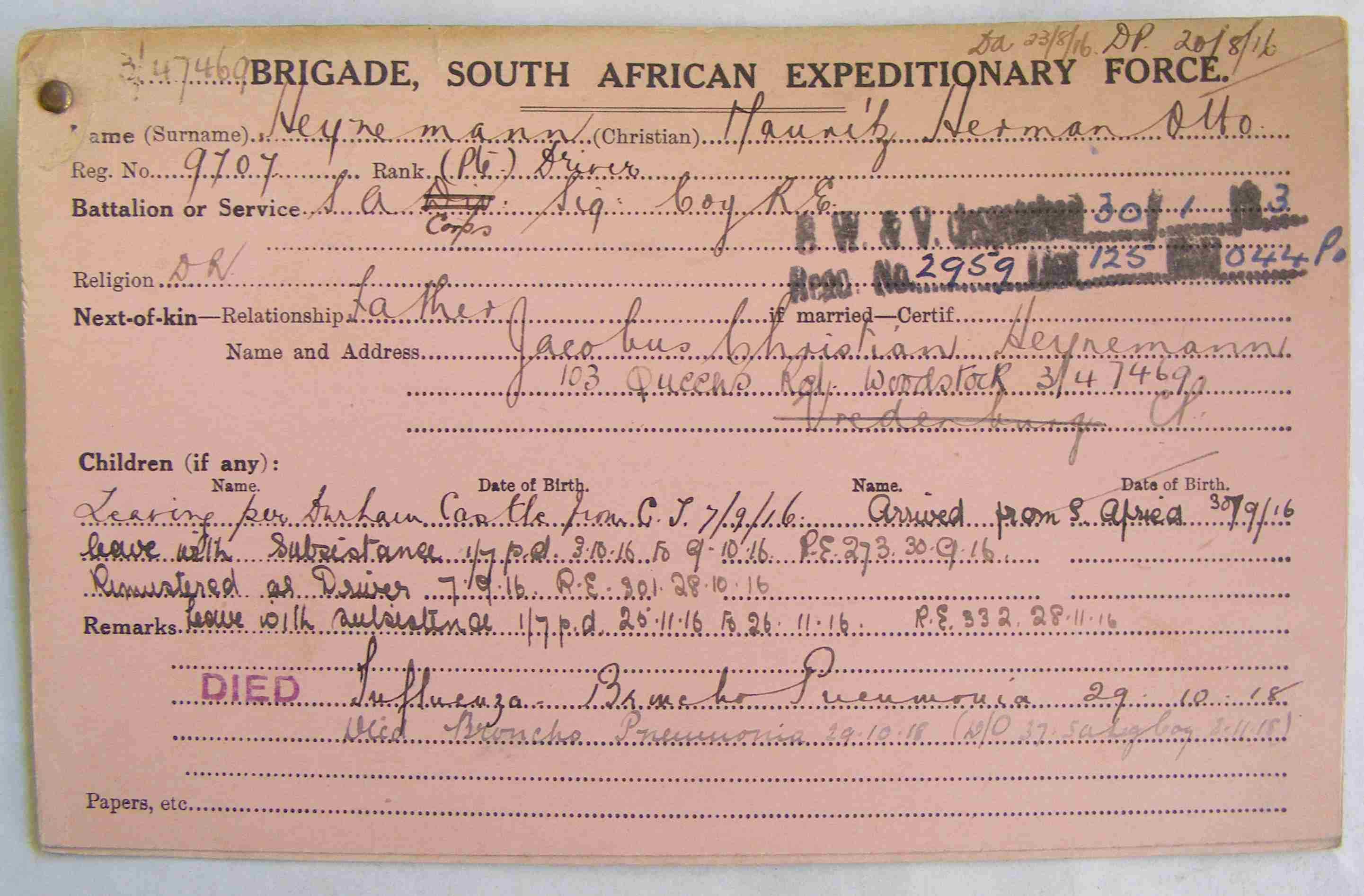 Son of Jacobus Christian and Johanna Heyneman, of Vredenburg Dish, Malmesbury, South Africa. |