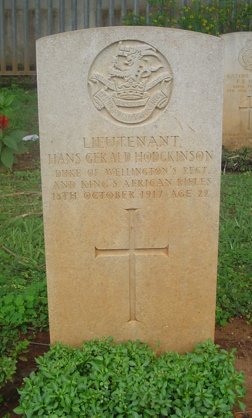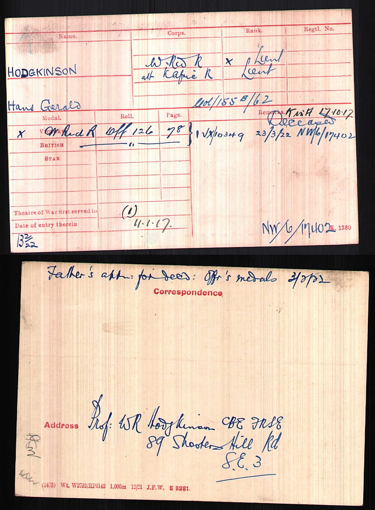 Son of Professor William Richard E. Hodgkinson, C.B.E., F.R.S.E., Ph. D., M.A., (Artillery College, Woolwich), and Mrs. Carolina Dorothea Hodgkinson, of 89, Shooters Hill Rd., Blackheath, London, England. Educated at Cranleigh and Worcester College, Oxford. ref. South African Roll of Honour 1914-1918