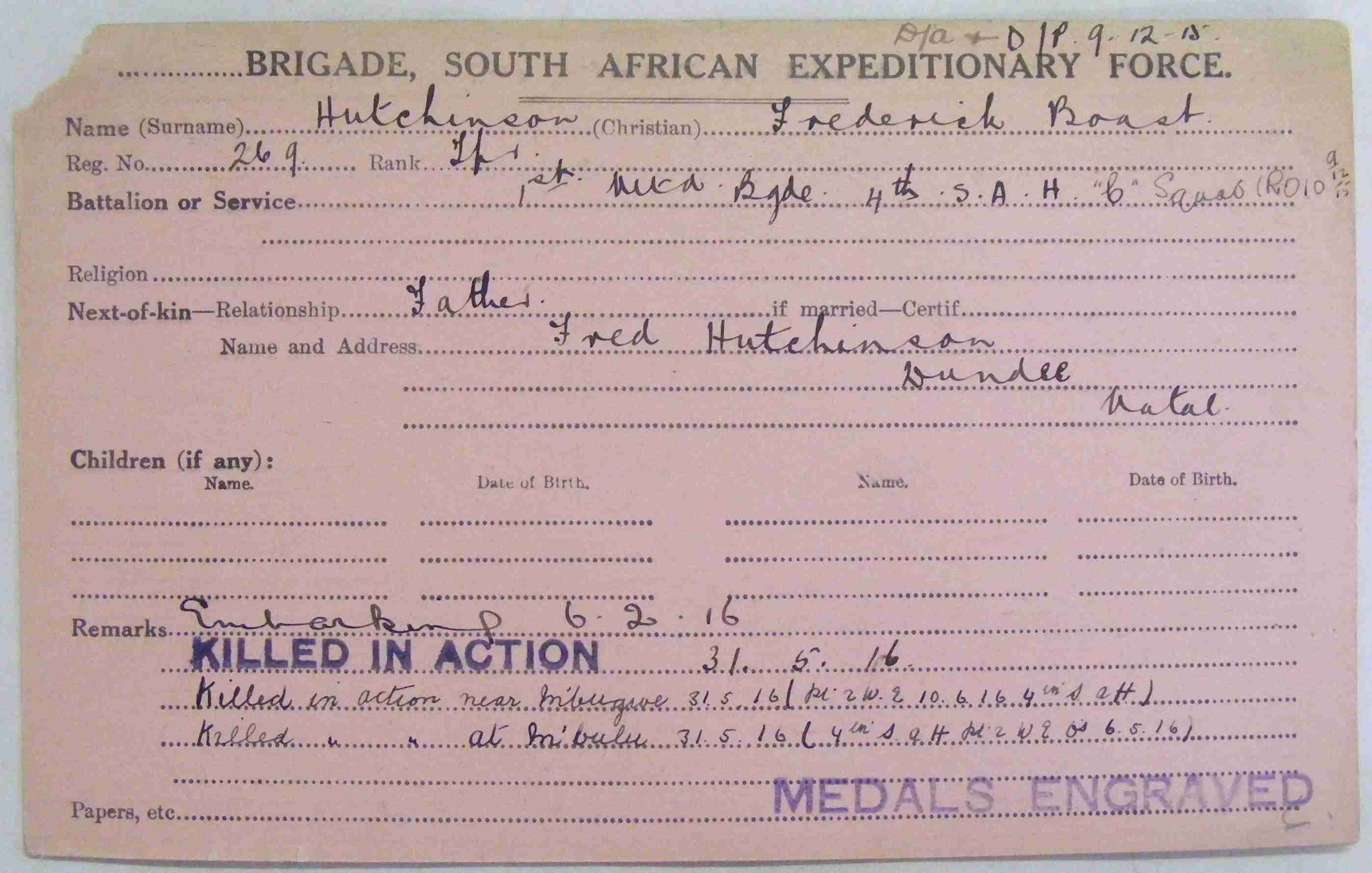 Son of Fred and Mary Alice Hutchinson, of Hilton Road, Natal, South Africa. Born Yorkshire, England. A pupil engineer. On Drax Grammar School Roll of Honour.