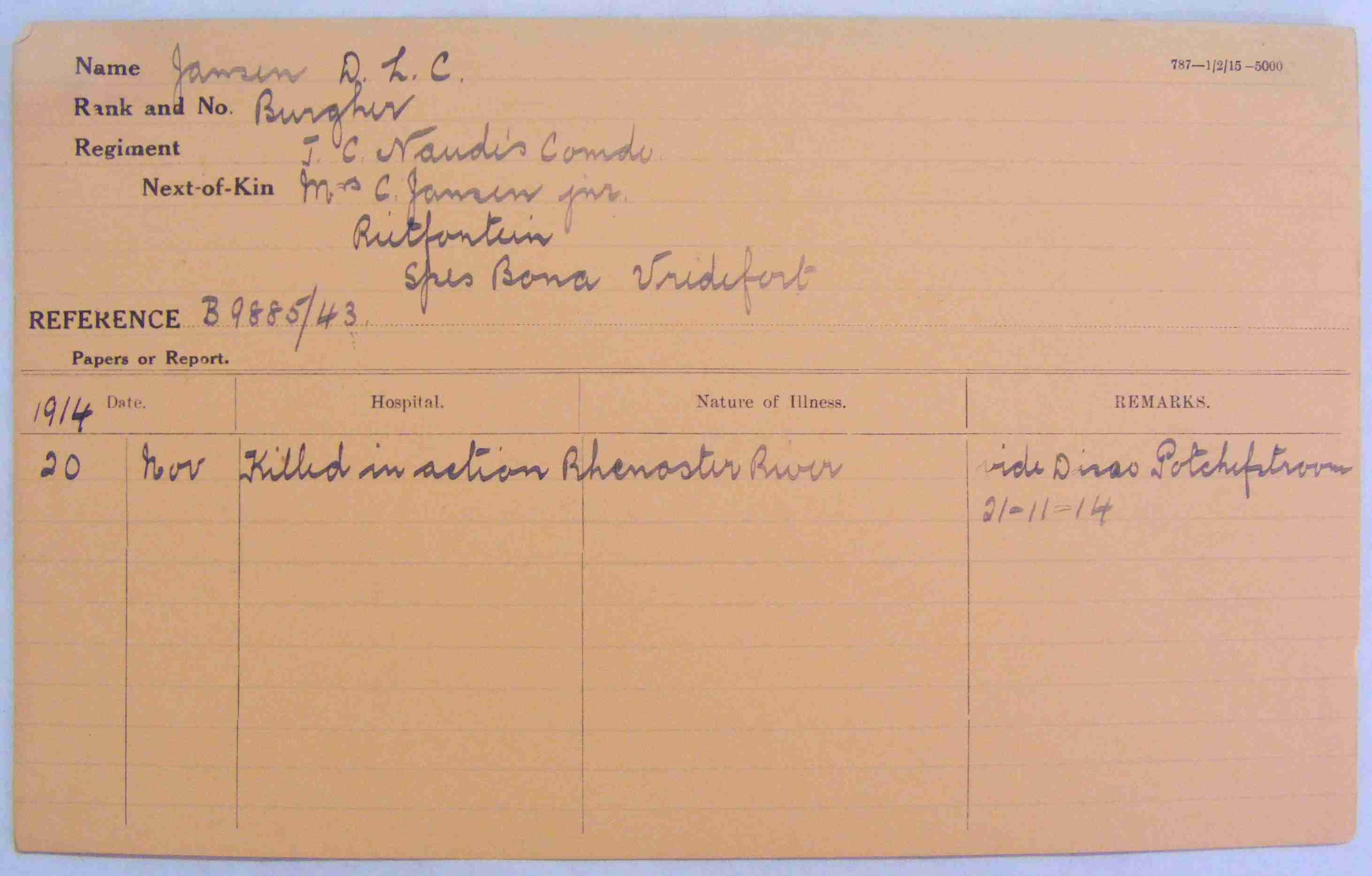 Killed in action, at Rhenoster River