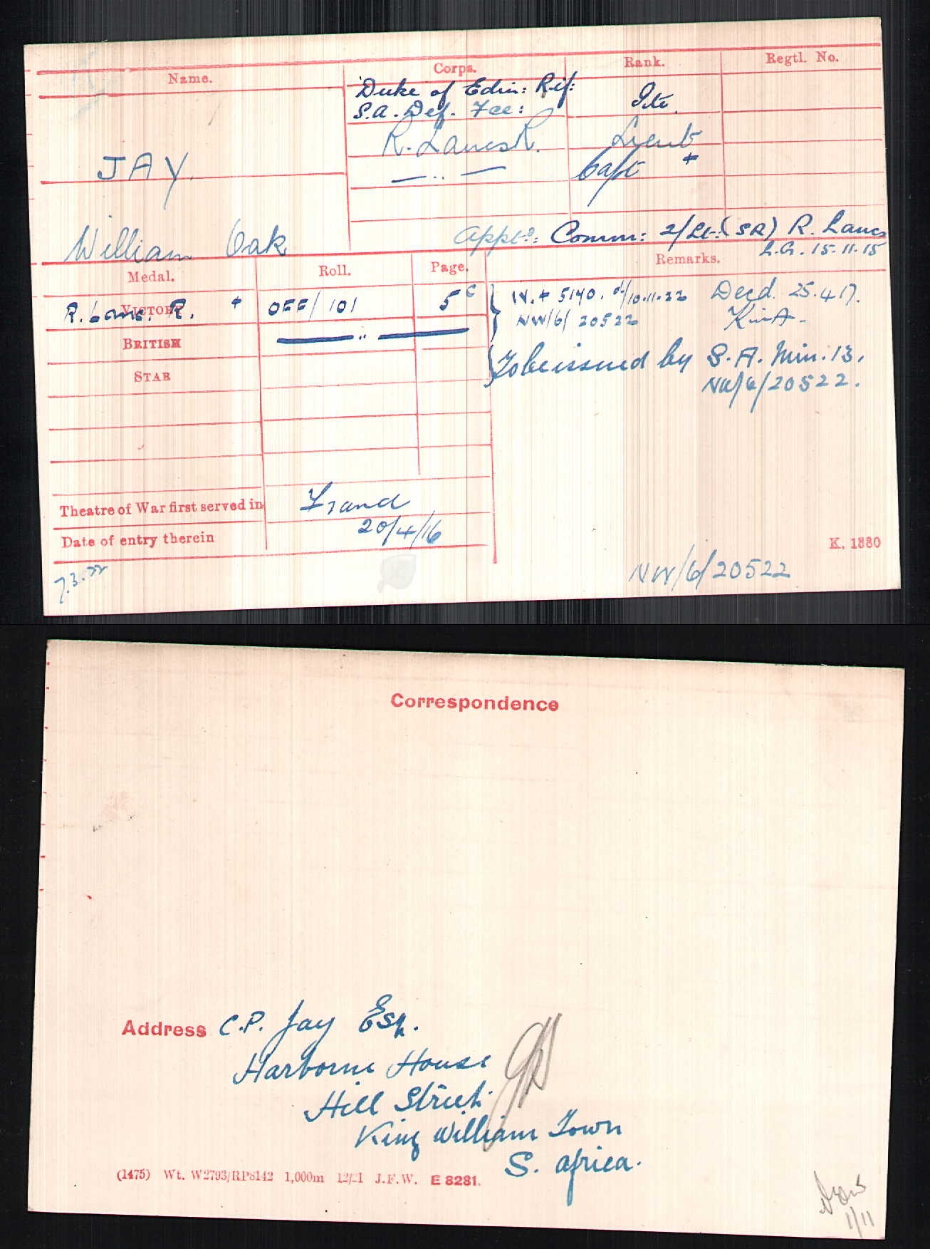 Son of Charles Alfred and Gertrude Mary Jay, of King William's Town, South Africa. Born King William's Town. A student. Also served in German South West Africa (1914-15).