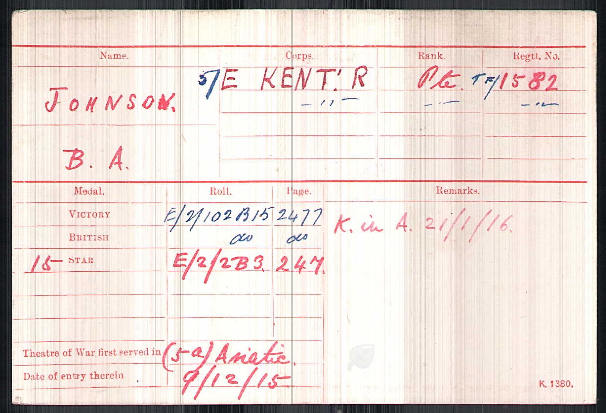 Son of George Lindsay Johnson, M.D., F.R.C.S., F.R.S. (Berlin and Italy), and Susan Schreiber, his wife. Born Hampstead, London. Educated Lockers Park, Hemel Hempstead (1896-99); Uppingham School, Rutland (1899-1905); he boarded in The Hall, School Praepostor (Prefect), 1st XV Rugby (1903 and 1904), 1st XI Cricket team in which he was good enough to be listed in Wisden's "Lives of the Fallen", the memorial to those great cricketers who died in the war. In October 05, he journeyed Freiburg-in-Sachsen, East Germany in October to study mineralogy and mining, basing himself at the Anglo-American Club; he gained his Diploma in metallurgy. Headed for South Africa in 1911 to join his father where he worked for a gold mining operation in the Transvaal, specialising in "cyaniding, milling and assaying". He gained his membership of the Institute of Mining and Metallurgy in 1913. Commemorated Lockers Park School; and in the Institute of Materials, Metallurgy and Mining (I.M3), 297 Euston Road, London NW1. Volunteered from South Africa. |