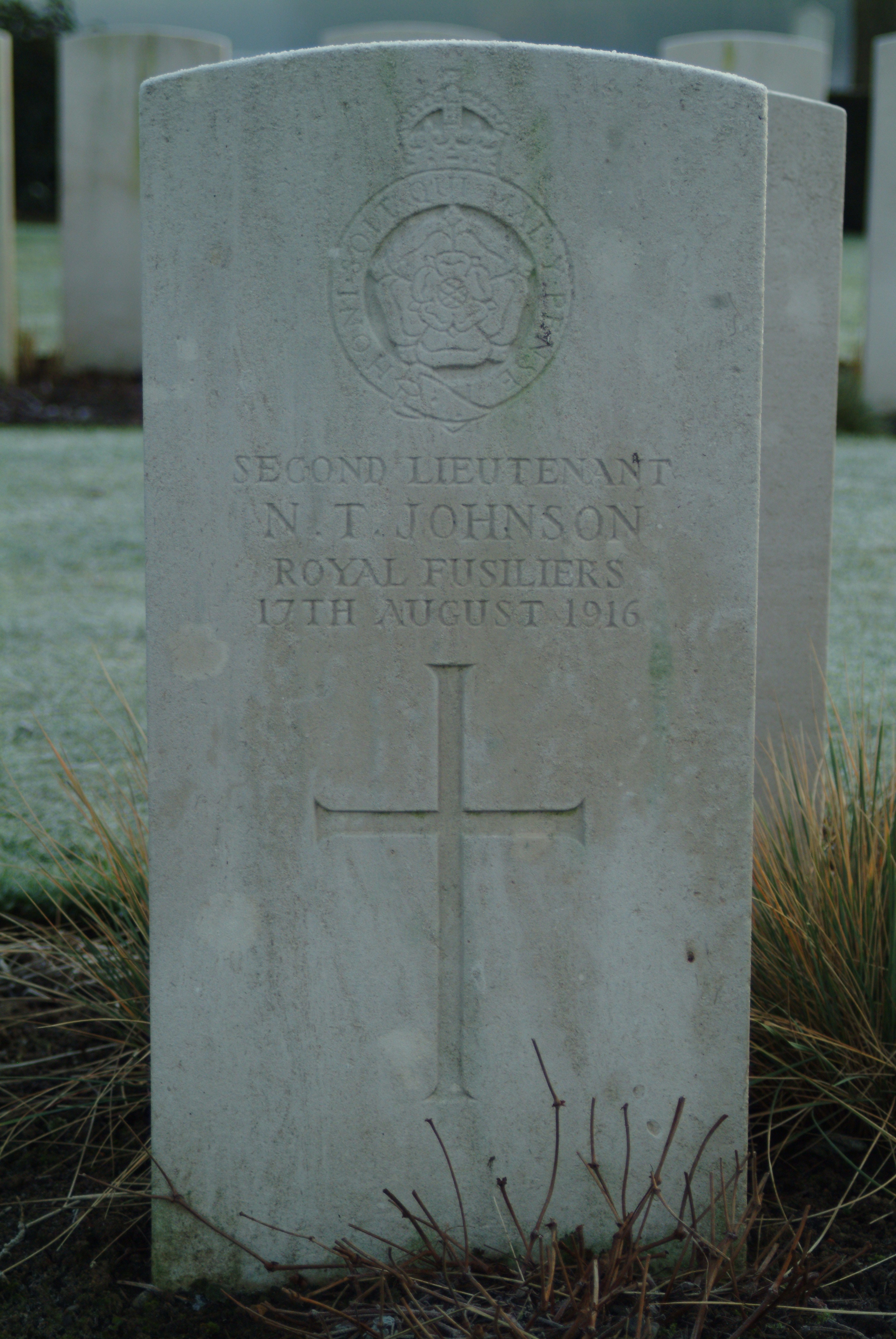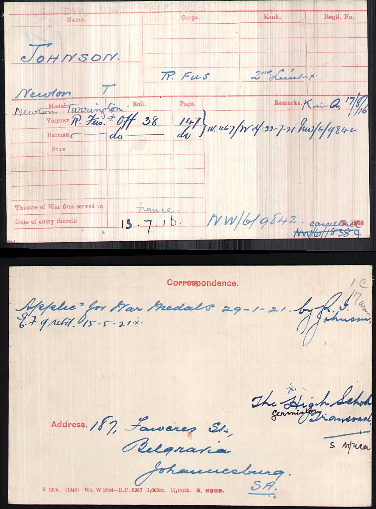 Next of kin, R. J. Johnson, of Belgravia, Johannesburg, South Africa. On war memorial for King Edward VII School, Johannesburg.