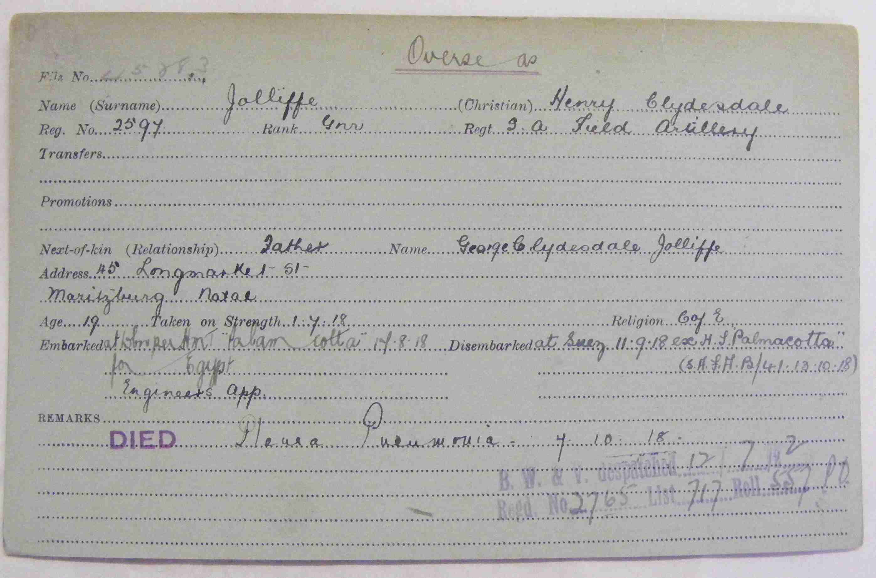 Son of Mr. and Mrs. George Clydesdale Jolliffe, of 45, Longmarket St., Pietermaritzburg, Natal.