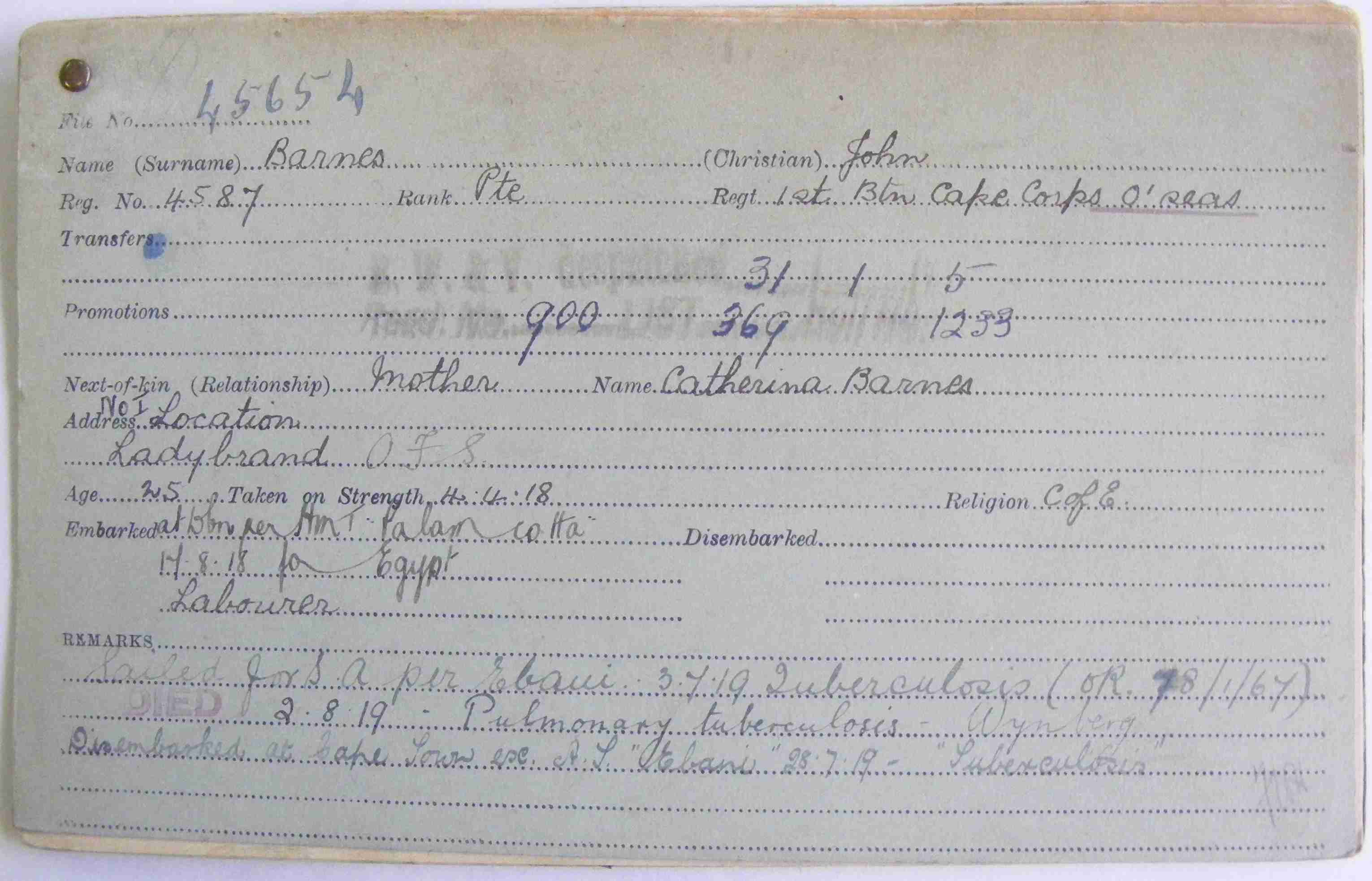 Son of Catharina Barnes, of No. 1 Location, Ladybrand, Orange Free State