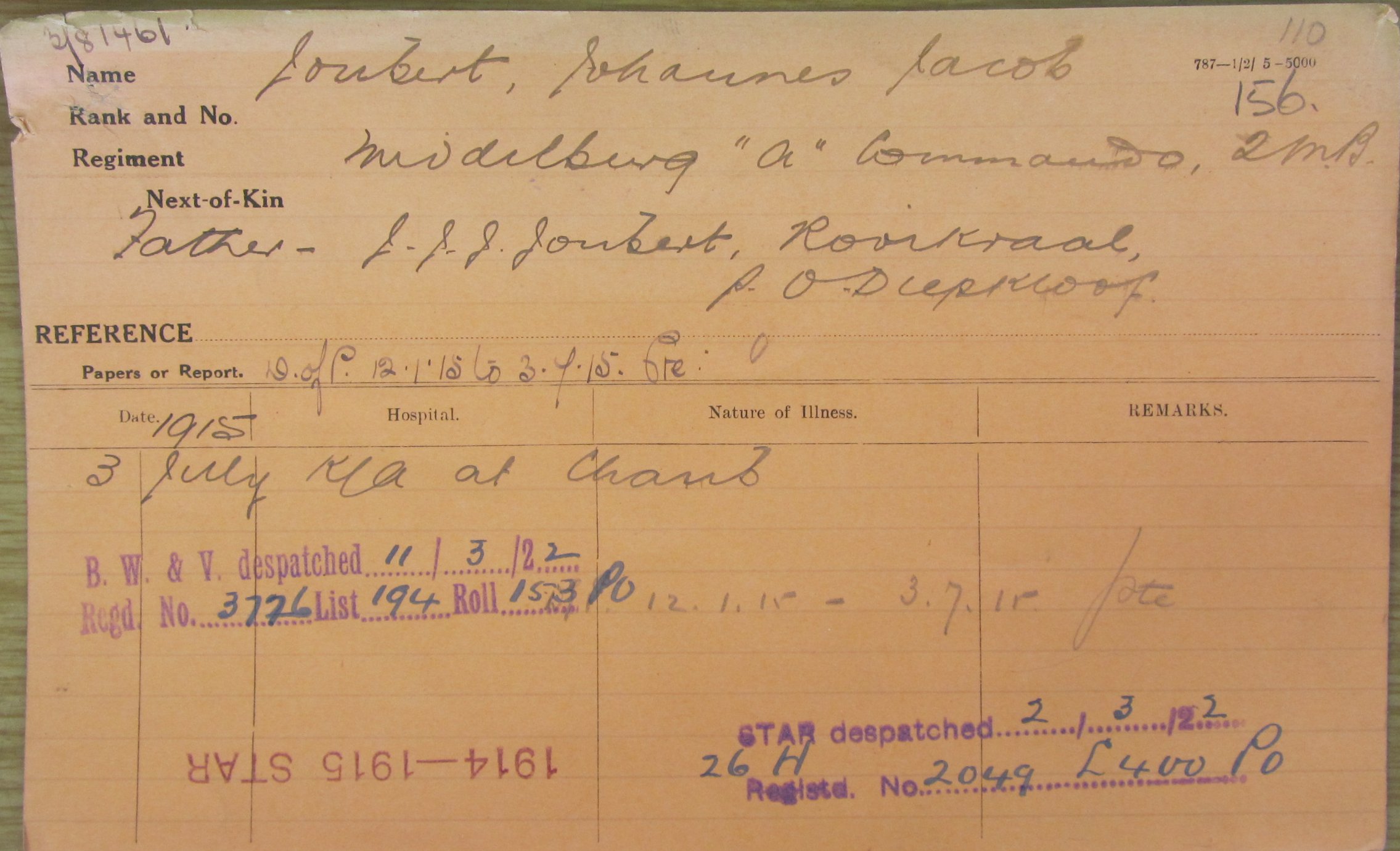 Son of Mr. J. J. J. Joubert, of Rooikraal, P.O. Diepkloof