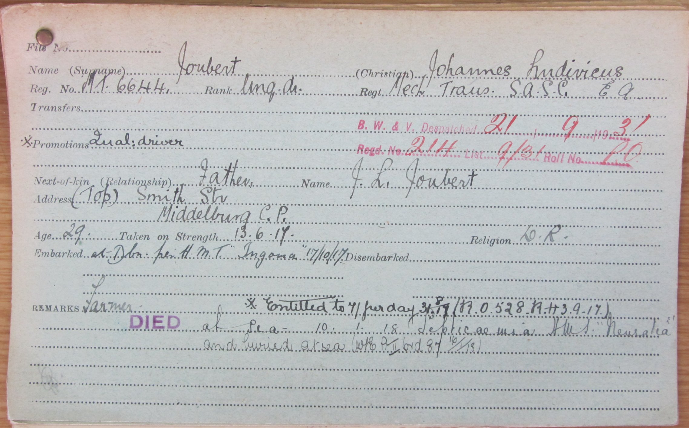 Son of Johannes Lodewicus Joubert and Anna Francina Joubert, of 55, Smid St., Middelburg, Cape Province.