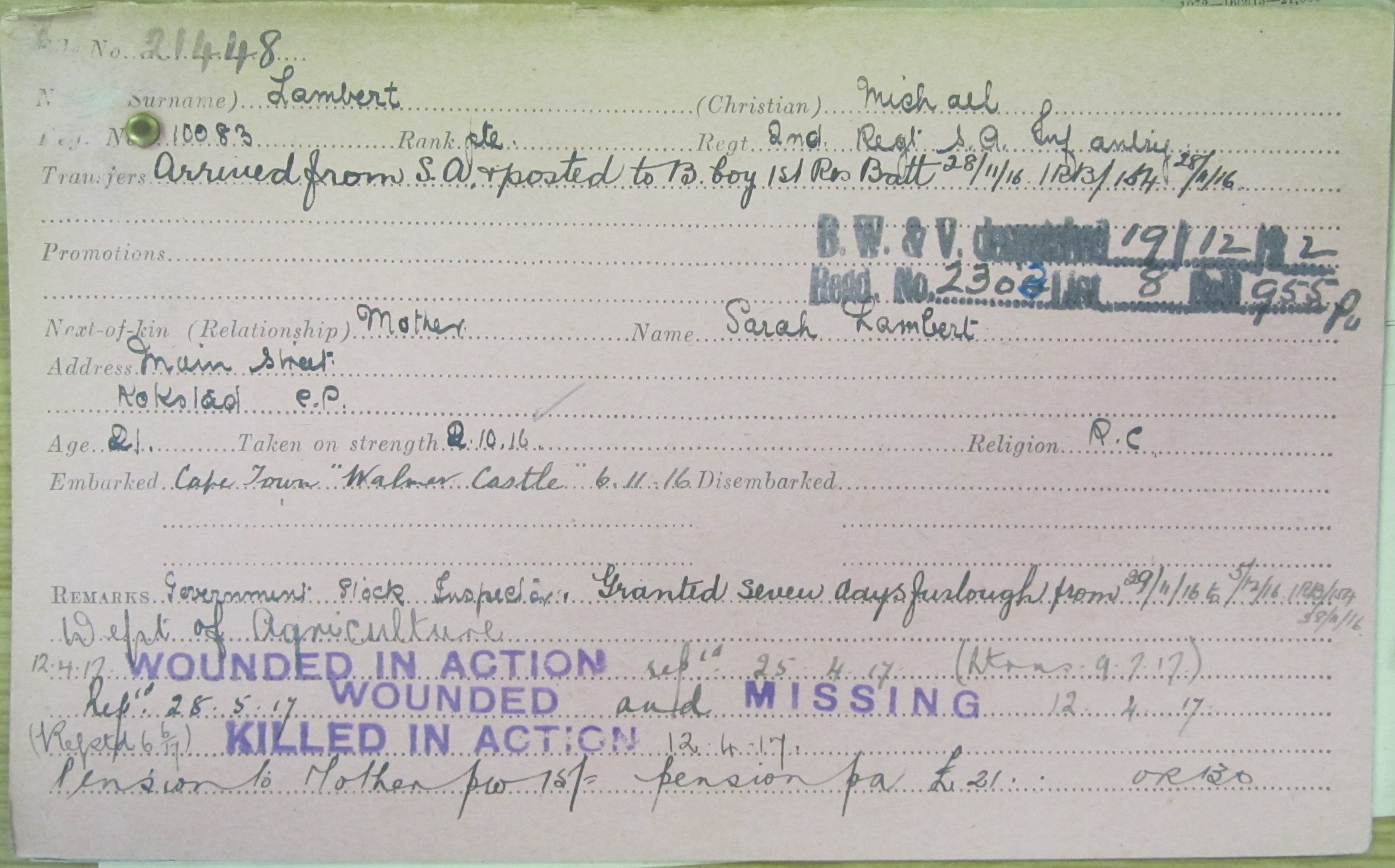 Son of Mr. T. S. and Mrs. Sarah Lambert, of "Bellevue" Main St., Kokstad, Cape Province. On Mount Currie National Park Boy Scout War Memorial near Kokstad |