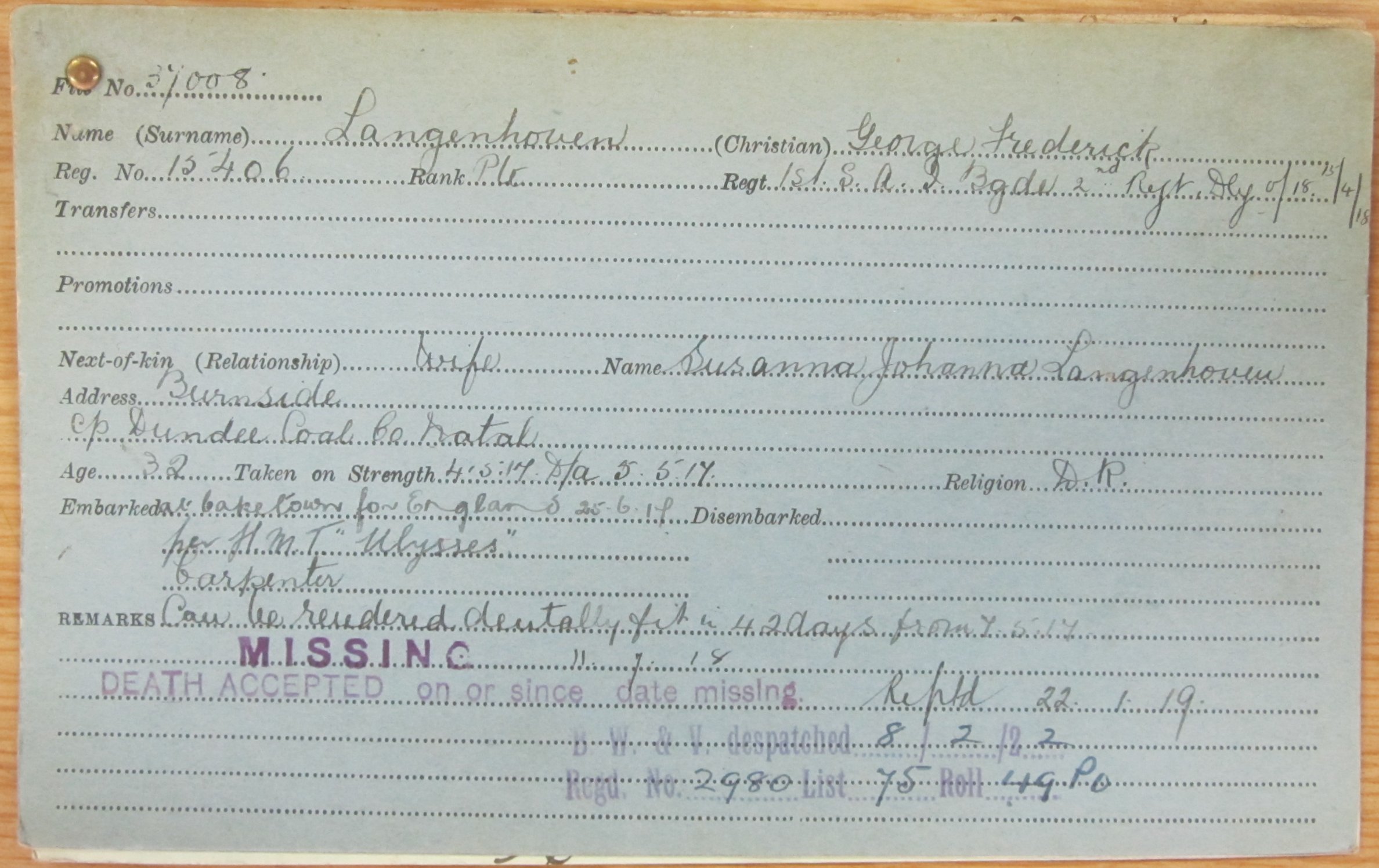 Son of Mr. P. H. M. Langenhooven, of Hattingspruit, Natal; husband of Susanna Johanna Langenhooven, of Durban, South Africa.