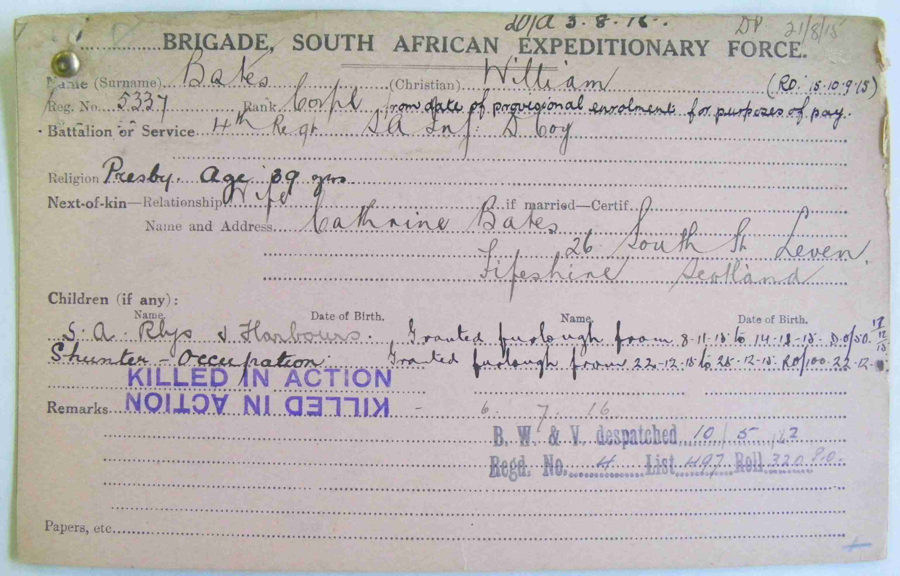 Husband of Cathrine Bates, of 26 South Street, Leven, Fifeshire, Scotland