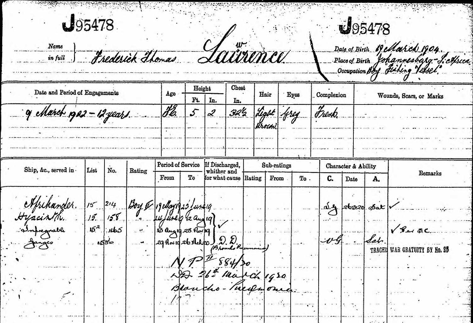Son of William James Lawrence, of Observatory, Cape Town, South Africa, and the late Blanche Lawrence.