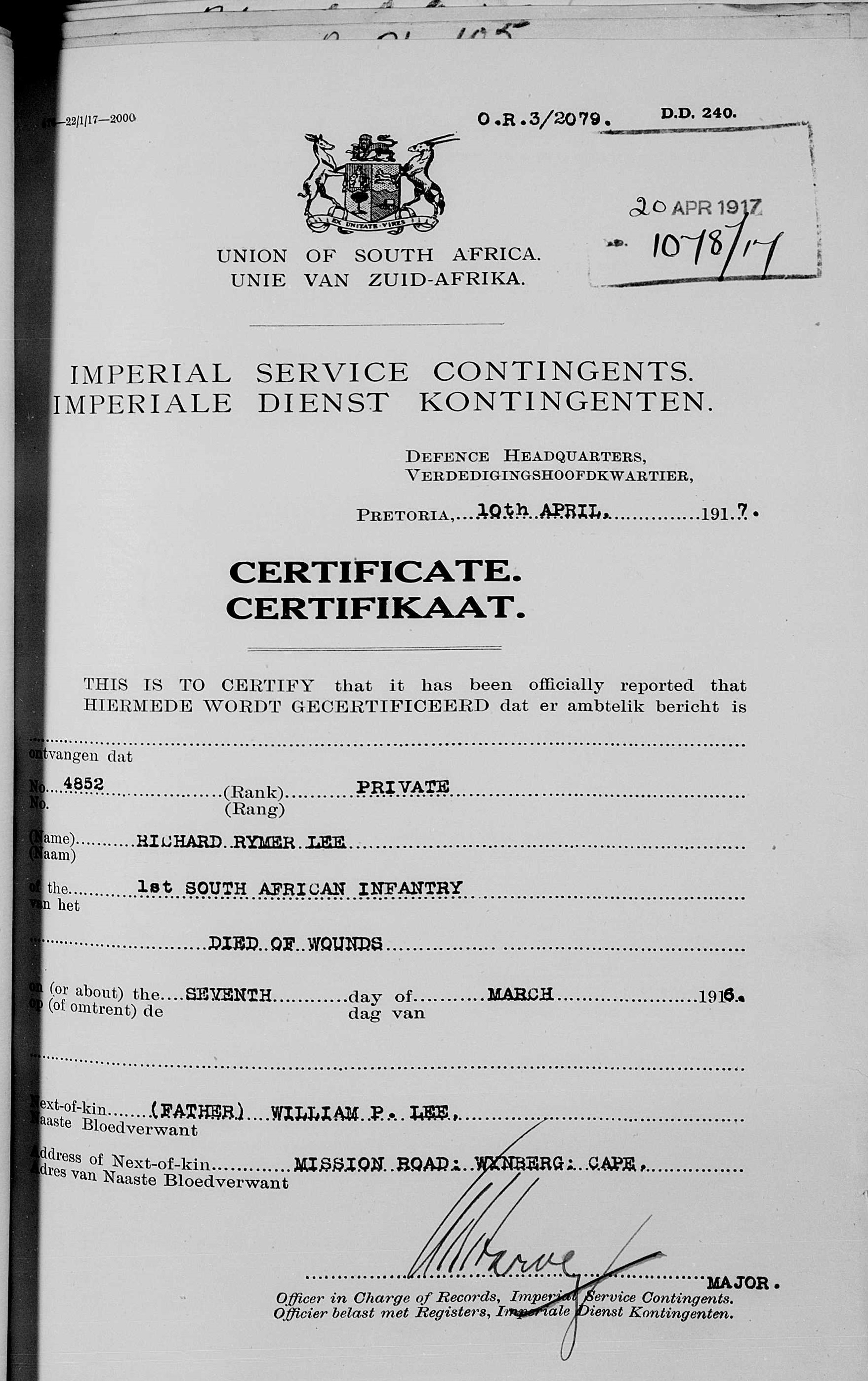 Son of William Peter and Sarah Kathleen Lee, of Mission Road, Wynberg, Cape Province. Born Cape Town. A clerk |