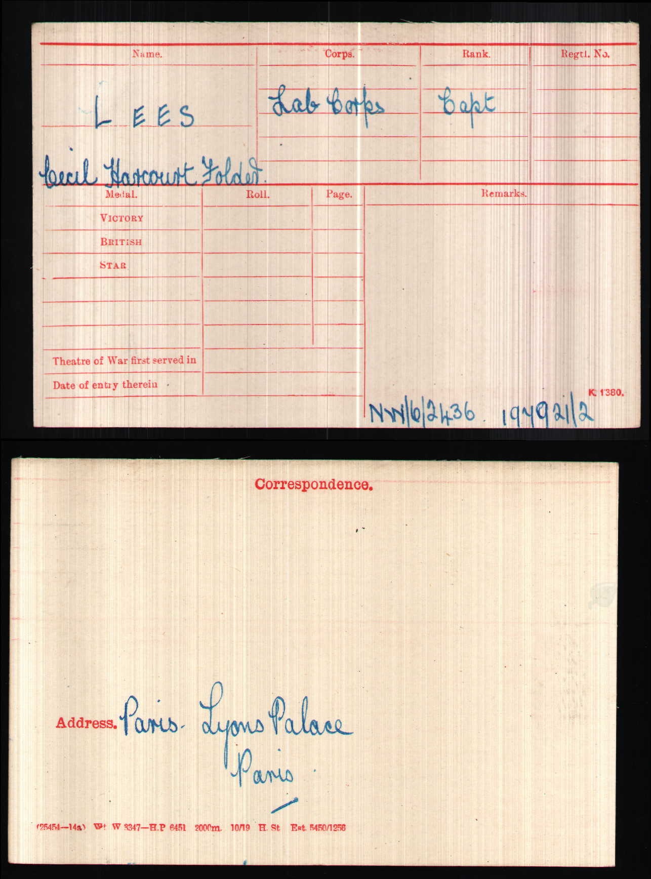 Son of Sir Harcourt James Lees and Harriet Helen Constance Lees. Husband of Jeannie King Lees, of Natal, South Africa. Brother of J. I. Lees, of Cheyne Walk, London. Born France.