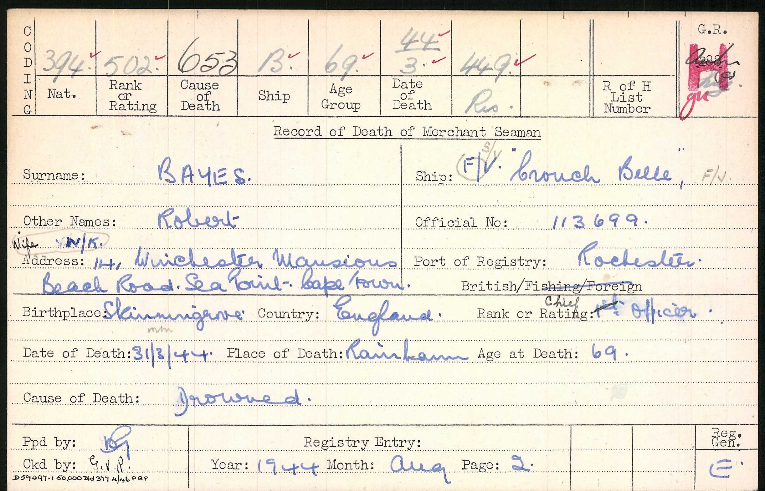 Born Skinningrove, England. Of 14 Winchester Mansions, Beach Road, Sea Point, Cape Town. ref. South African Roll of Honour 1939-1945 ***Date on headstone is date of burial |