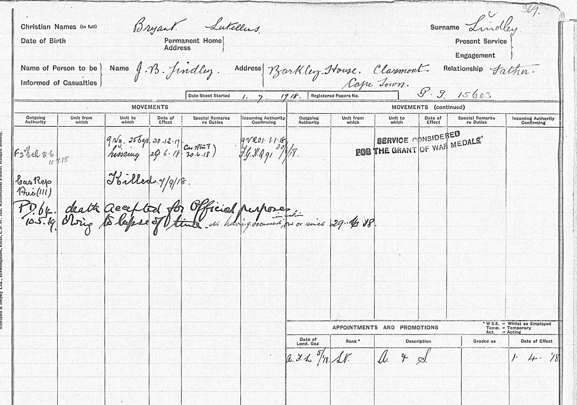 Son of J. Bryant Lindley and Mary Eveline Lindley, of Barkly House, Claremont, Cape Province, South Africa. Educated at St. Andrew's College, Grahamstown