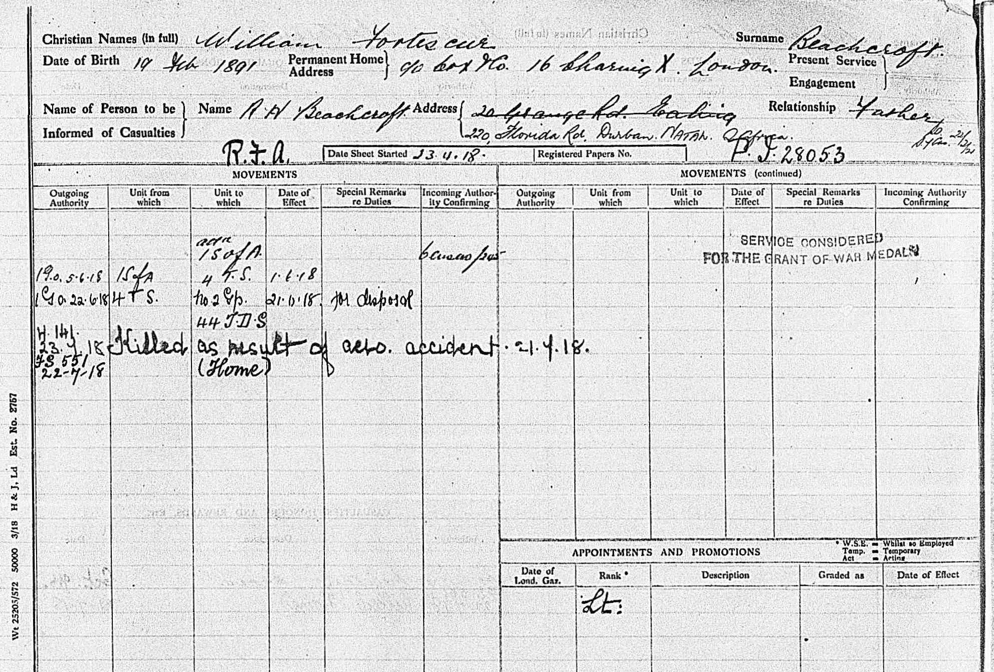 Son of Mr. and Mrs. R. H. Beachcroft, of Durban, Natal, South Africa. |