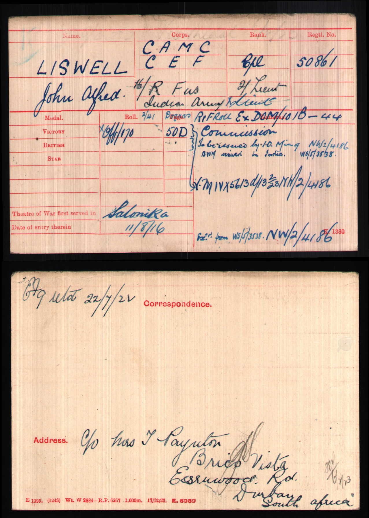 Son of John Andrew and Minnie Liswell; husband of Elsie Liswell (nee Poynton), of Durban, Natal, South Africa. Born Burlington, Hants, Nova Scotia, Canada