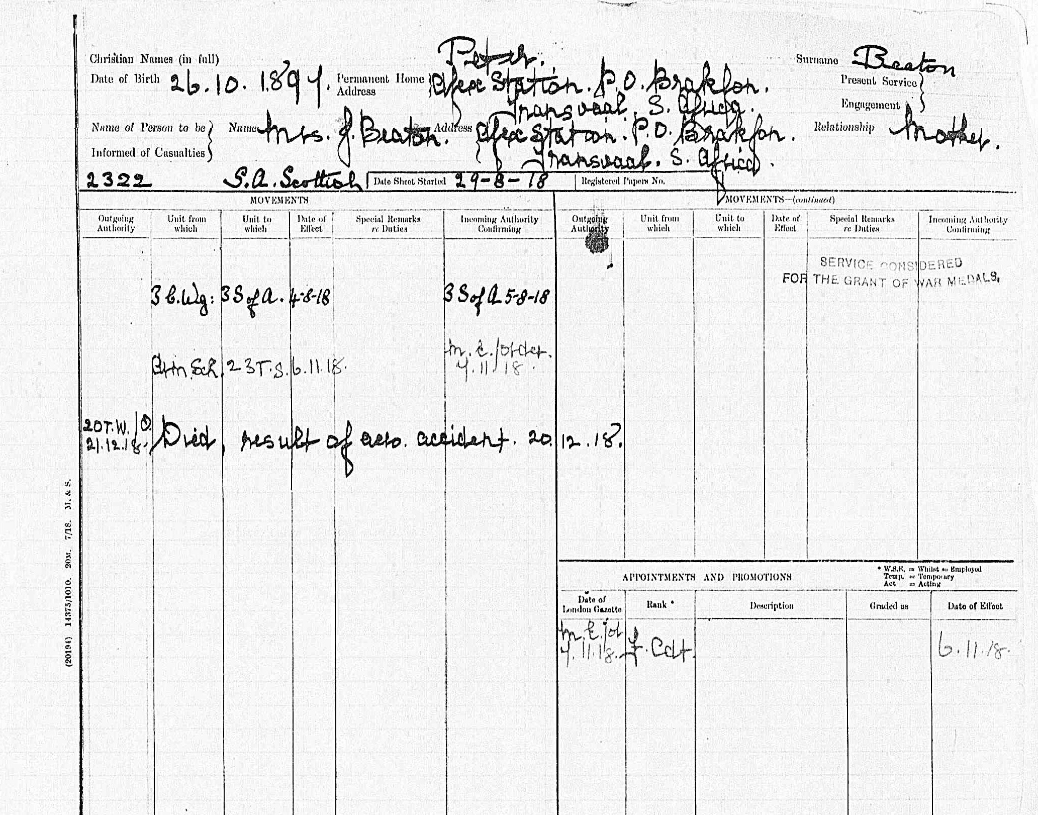 Son of John and Marion Beaton, of Apex Station, Brakpan, Transvaal, South Africa. Native of Scotland. |