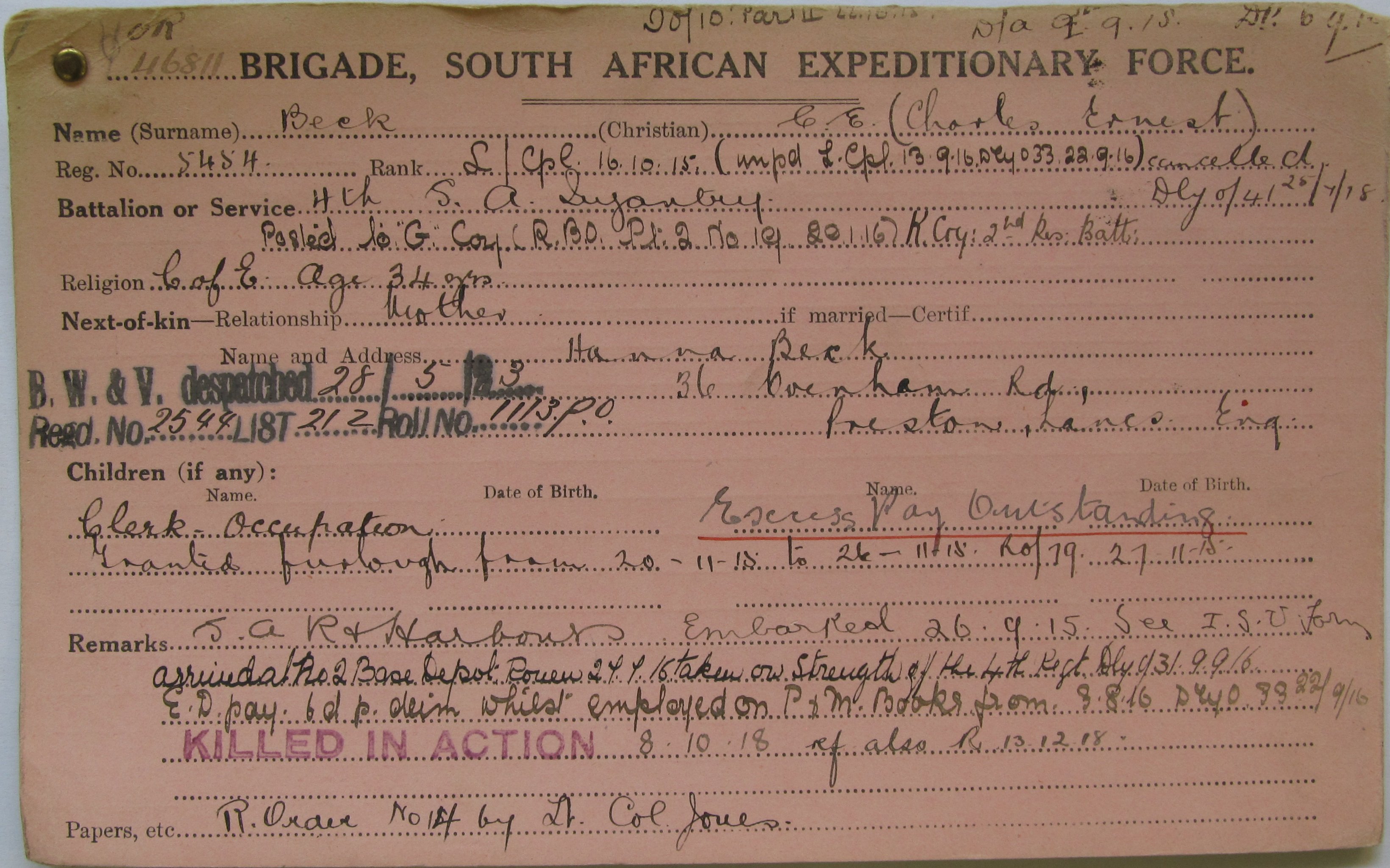 Son of John and Hannah Beck, of 89, Chaucer Drive, St. Giles, Lincoln, England. Born Halifax, Yorkshire. A clerk