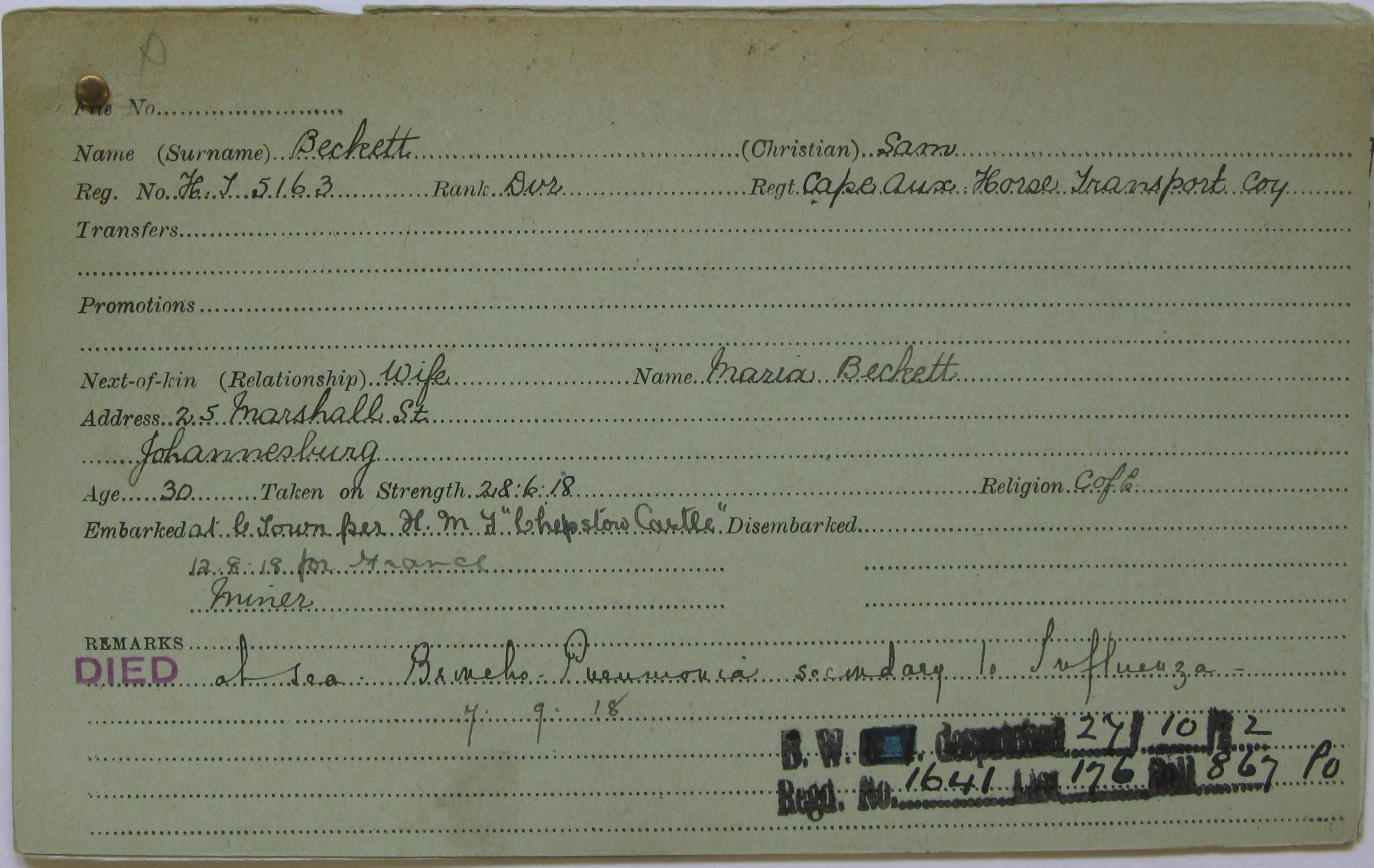 Died of broncho pneumonia and influenza, at sea, en route South Africa to U.K. on S.S. "Chepstow Castle"