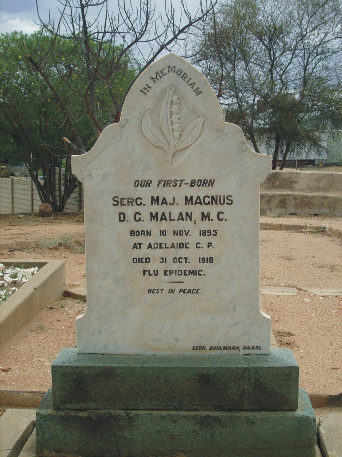 Son of Daniel J. Malan, of Blydschap, P.O. Klippan, via Ventersburg Road. Born at Adelaide, Cape Province