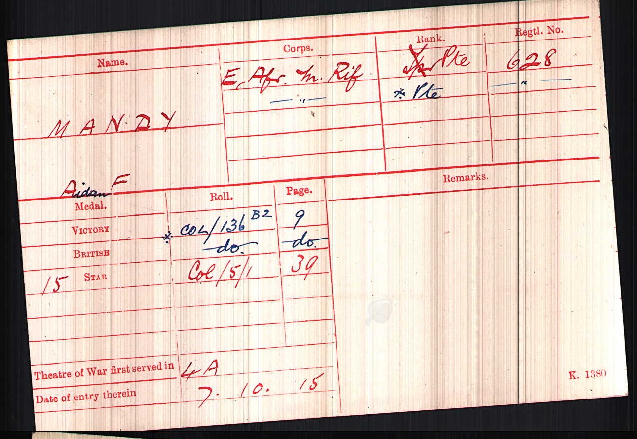 Son of James D. and Elizabeth Mandy. Commemoration stone in Grahamstown Old Catholic Cemetery. His brother also died on service