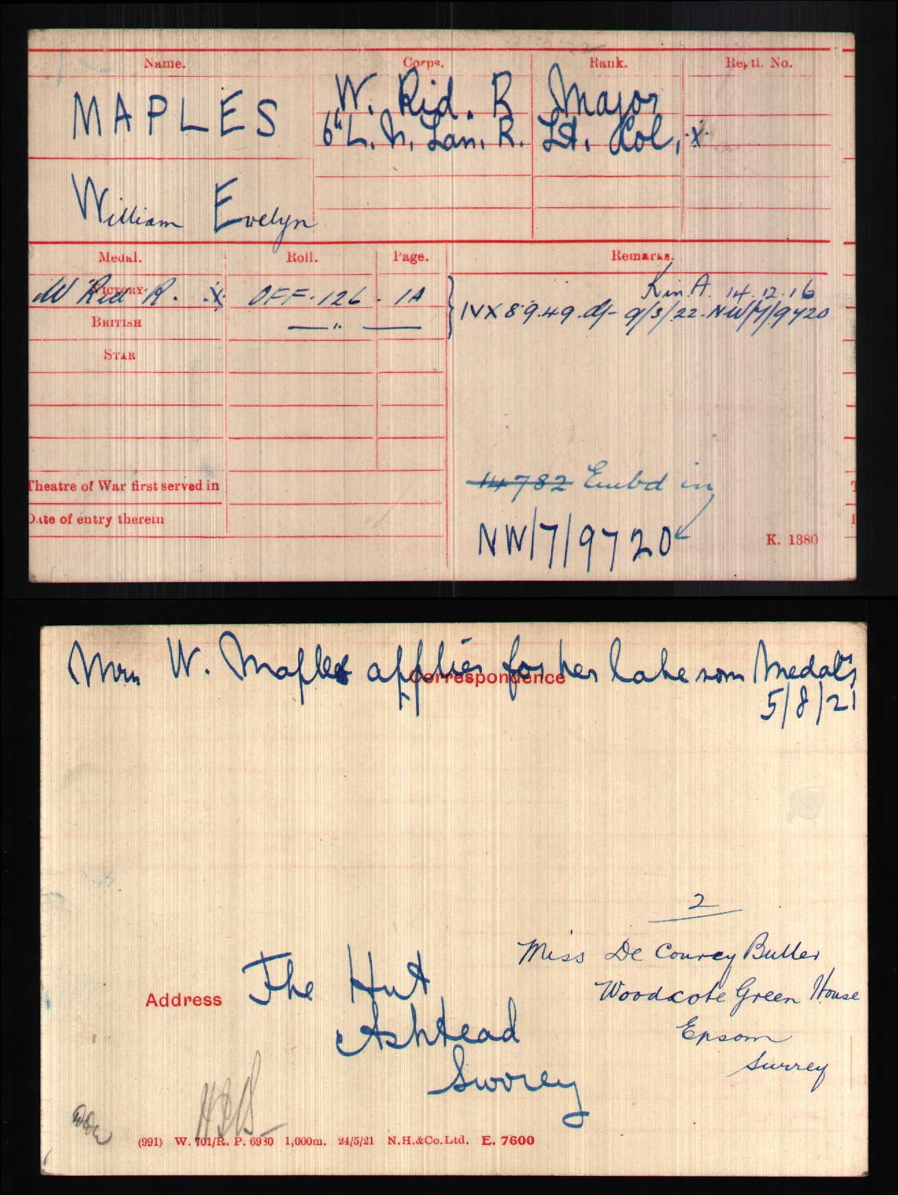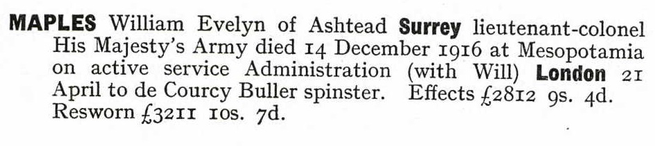 Son of the late William and Elizabeth Maples, of "The Hut", Ashtead, Surrey. One of three Wykehamist brothers, another of whom, Captain Kenneth James Maples (G, 1890-1896), South Staffordshire Regiment, fell on May 16th 1915. He came to Winchester from Mr. Johnson's school at Ashtead, and played in Commoner XV. After a short period with the Militia he entered the Regular Army (Duke of Wellington's West Riding Regiment) in 1899. He served in South Africa from 1899-1902, and later on took part with the King's African Rifles in the Nandi and Somaliland campaigns. He travelled widely in East Africa, Abyssinia and the Himalayas, and was a fellow of the Royal Geographical Society. In 1910, he went to India, and shortly before the war passed into the Staff College at Quetta though he resigned this three months later. ref. South African Roll of Honour 1914-1918 |