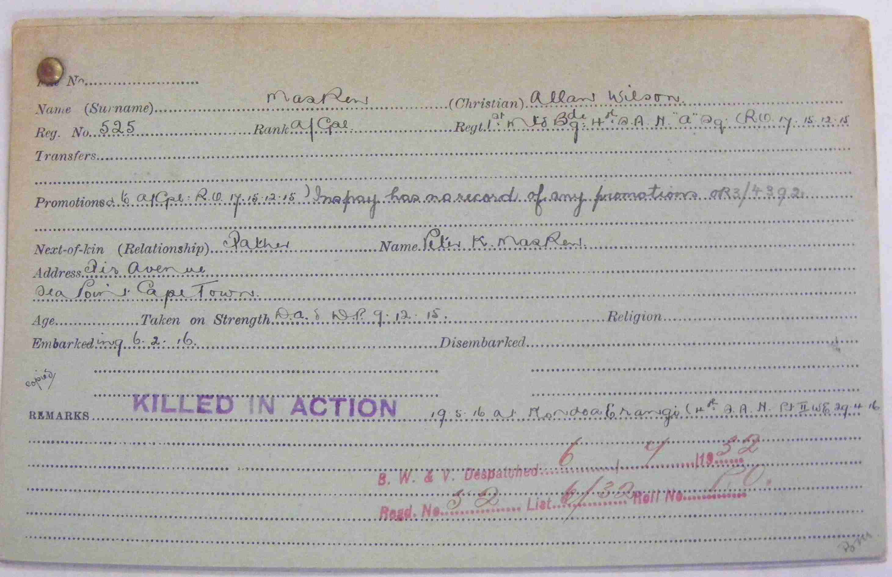Son of Petrus Keytel and Elizabeth Jacoba Maskew (nee Roos), of 117, St. George's St., Cape Town, South Africa. Born Sea Point. A civil servant. Also served in German South-West Africa. Commemoration stone in Cape Town (Maitland) Cemetery