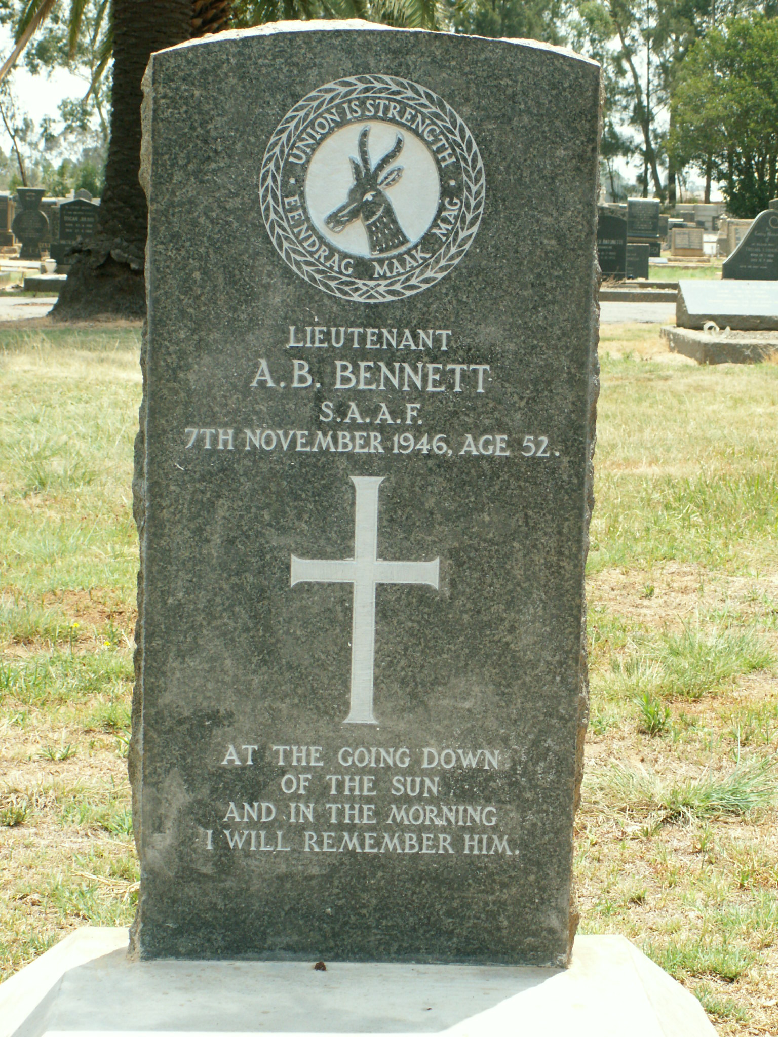 Son of Thomas and Amy Bennett; husband of Elsie Marie Bennett, of Brakpan. Born Peddie, Cape Province. A bookkeeper