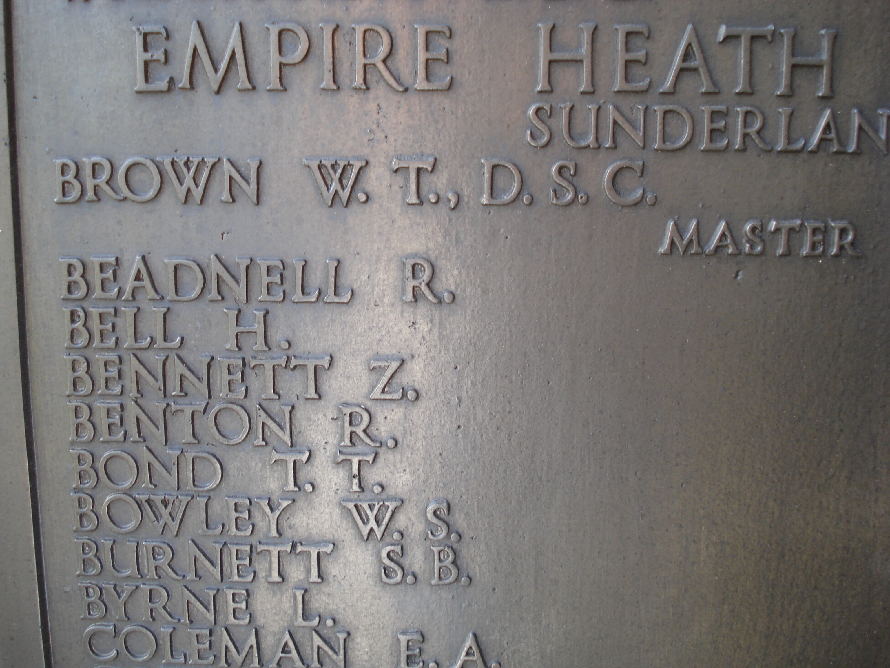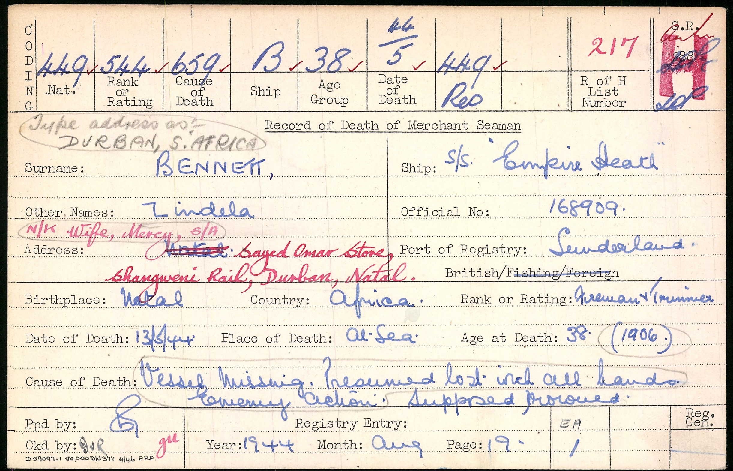 Husband of Mercy Bennett, of Sayed Omar Store, Shangweni Rail, Durban, Natal. Born Natal, South Africa. ***Some records show the Empire Heath as being sunk 11th May and CWGC uses 13 May for commemoration. ref. South African Roll of Honour 1939-1945