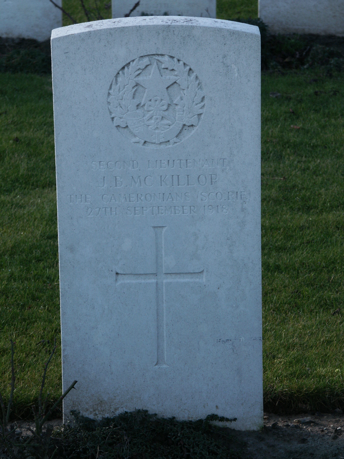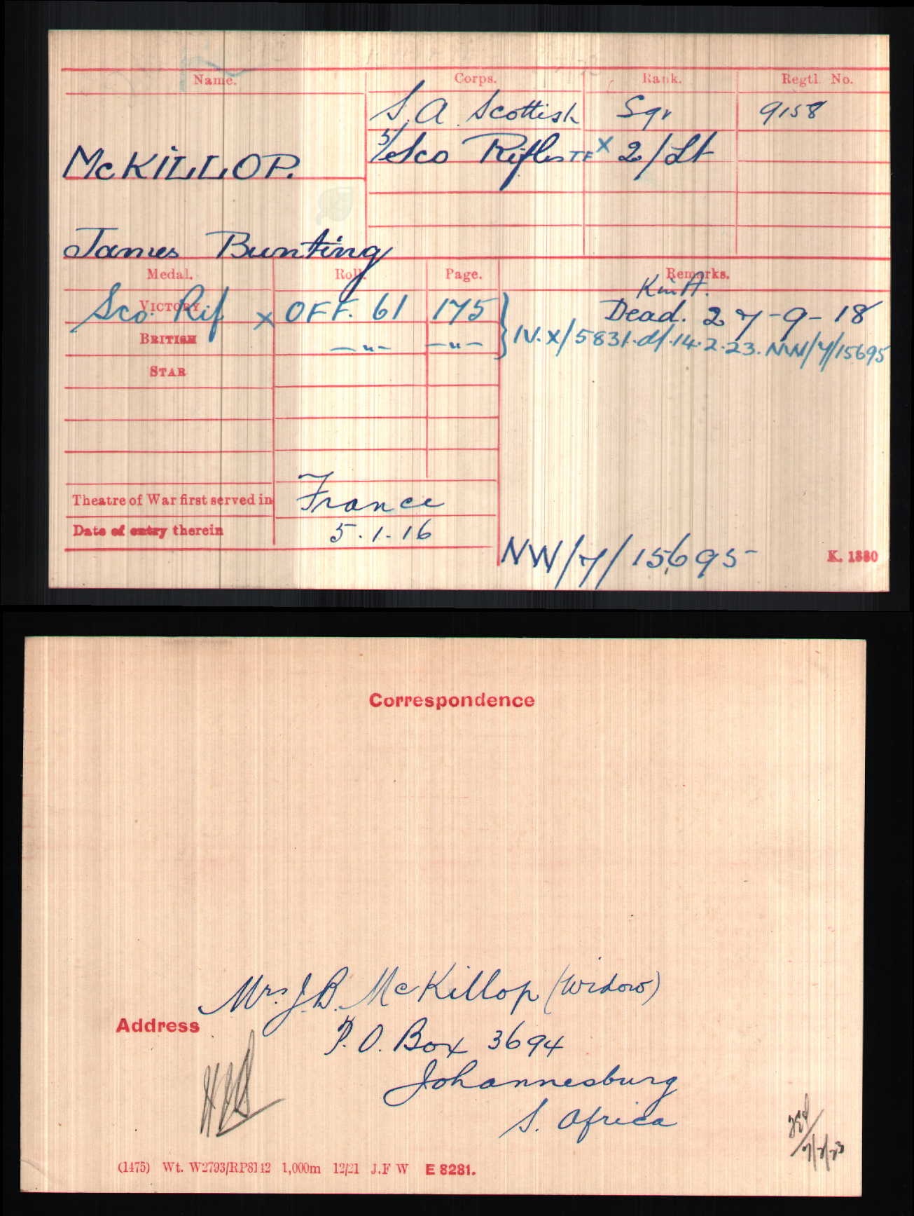 Husband of Katrine Alice McKillop, of Johannesburg, South Africa. Born at Oban, Scotland. James Bunting McKillop was born in Oban on 15 July 1879. He was educated at Oban High School and Glasgow University. Living in Johannesburg and a Tobacconist by occupation, he entered the France/Flanders theatre of war on 5 January 1916, as a Sergeant in the South African Scottish Regiment. He was serving in the 4th South African Infantry when he applied for admission to an officer cadet unit. He had previously served as Trooper for 2 years 9 months in the Scottish Horse Volunteers, 1 year in the Transvaal Scottish Volunteers and 1 year in the Imperial Light Horse. He was commissioned into the 5th Battalion Scottish Rifles on 31 July 1918. |