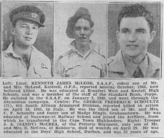 Son of George and Johanna McLeod, of Kestell, Orange Free State. Born Kestell. Educated at Beaufort West and Kestell High Schools. A bank clerk with Standard Bank. |