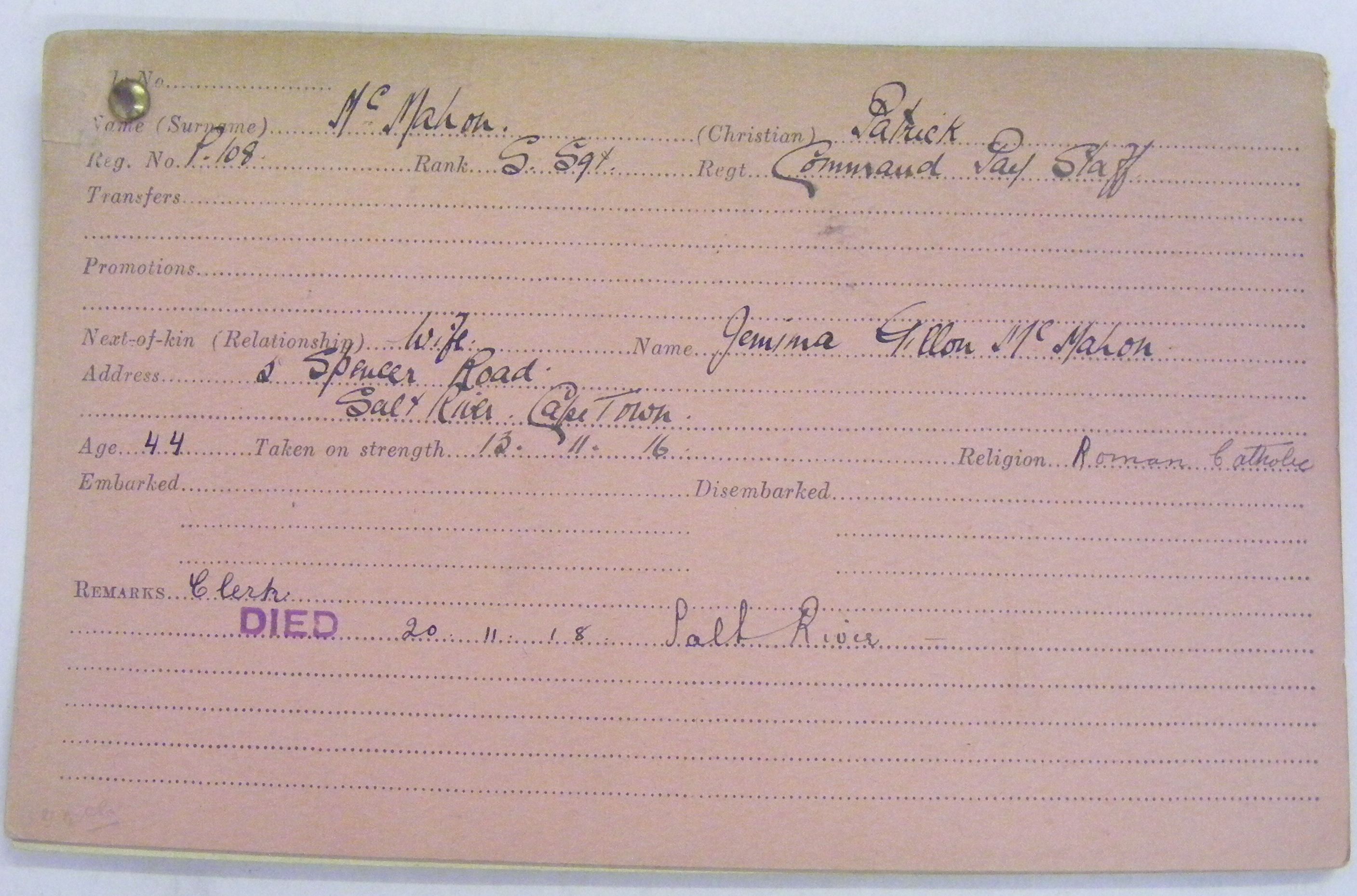 Husband of Jemima Gillon McMahon, of Salt River, Cape Town. ***Might be Joseph Patrick