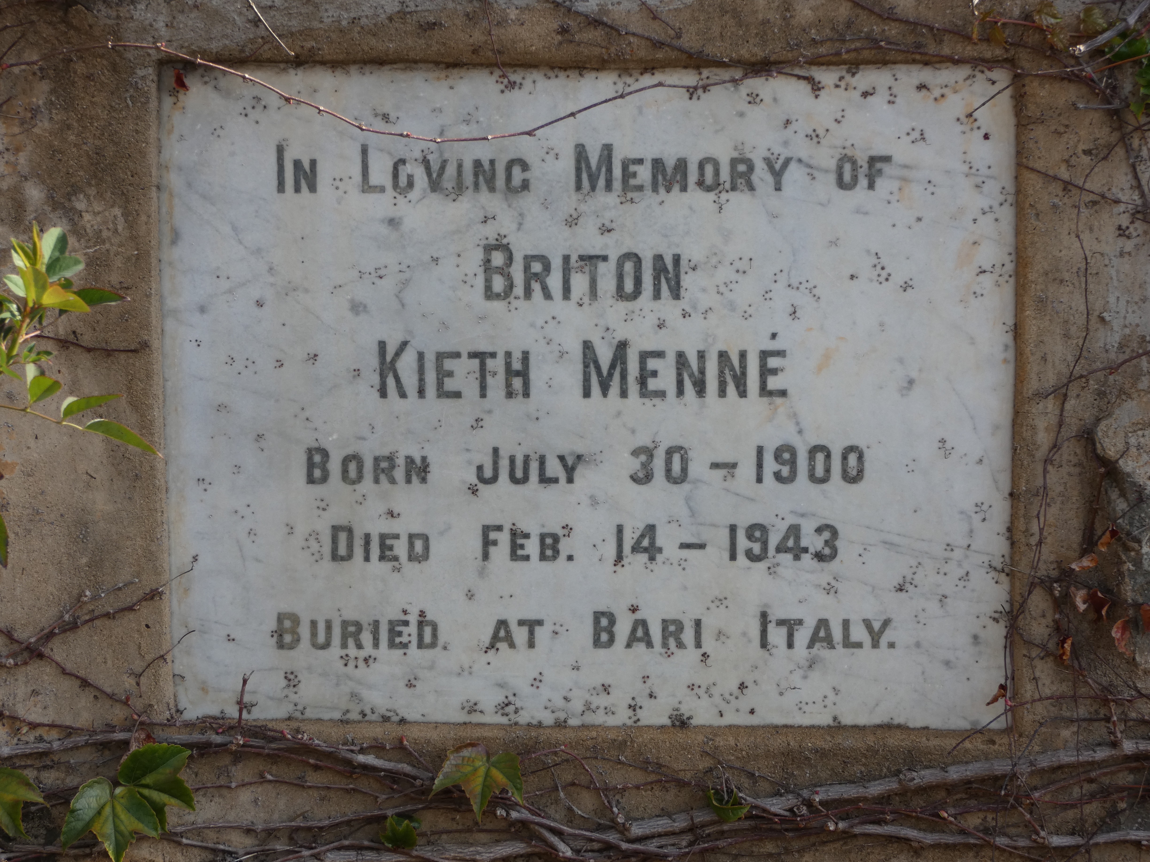 Son of Daniel Brink and Elizabeth Francis Menne; husband of Mary Maud (nee Handley) Menne, of Empangeni, Natal, South Africa. Educated at Hilton College, Natal. Served in WW1. His brother also died on service. Commemoration stone in Umvoti District, Greytown, Sophiadale 1360, Menneheim Farm cemetery