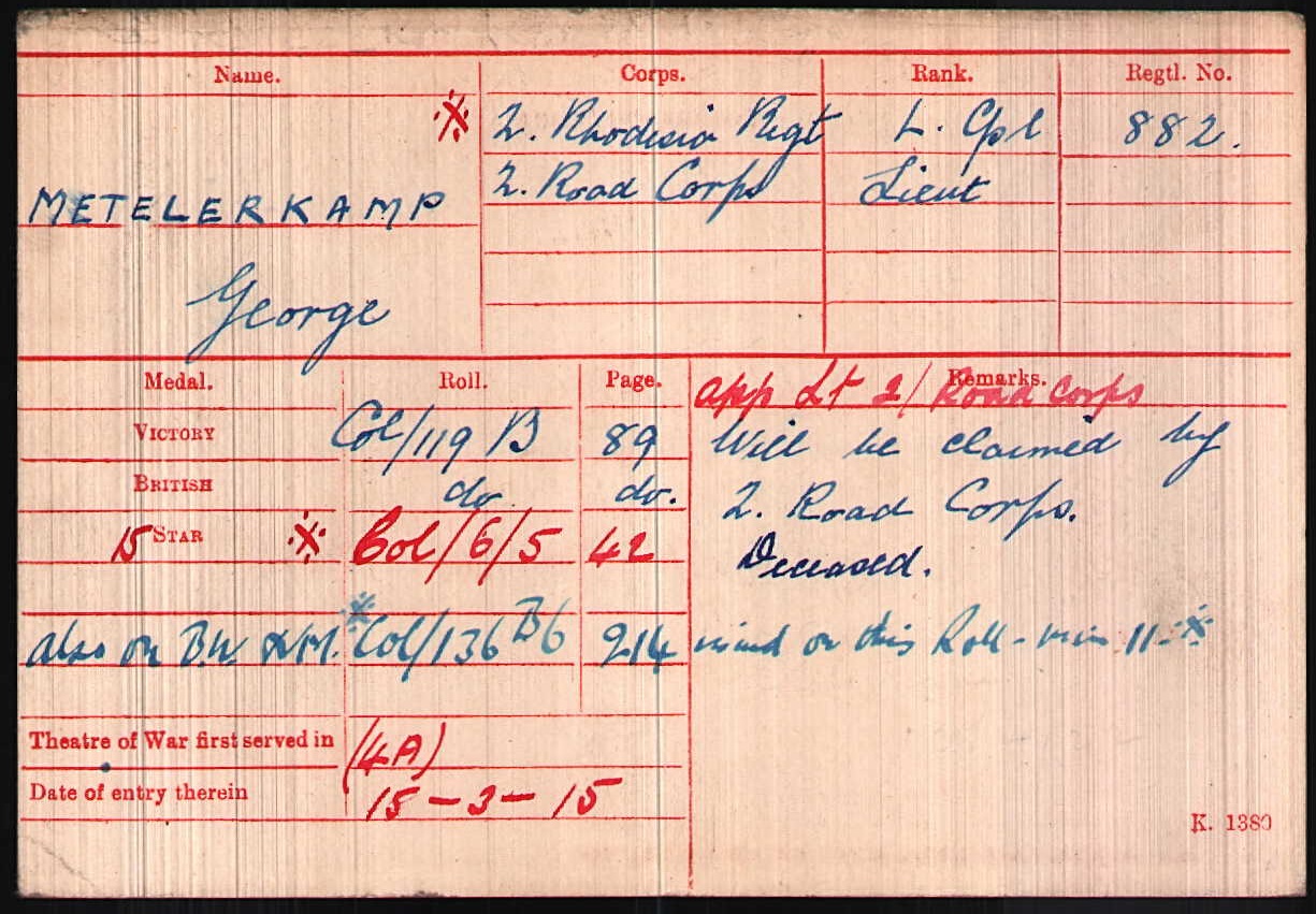 Son of Peter Carl and Johanna Elizabeth Maria Meterlerkamp, of Knysna, Cape Province, South Africa. |