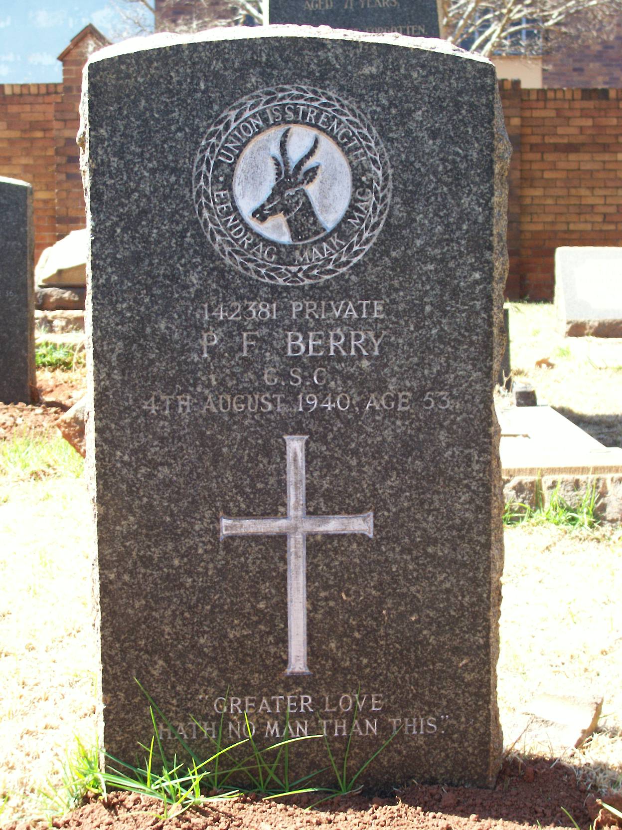 Son of John William and Caroline Berry, of East London. Husband of Violet Evelyn Berry, of Adelaide, Cape Province. Born Herschell, Cape Province. A clerk for a general dealer. He had 3 children. On Adelaide Town War Memorial, Eastern Cape.